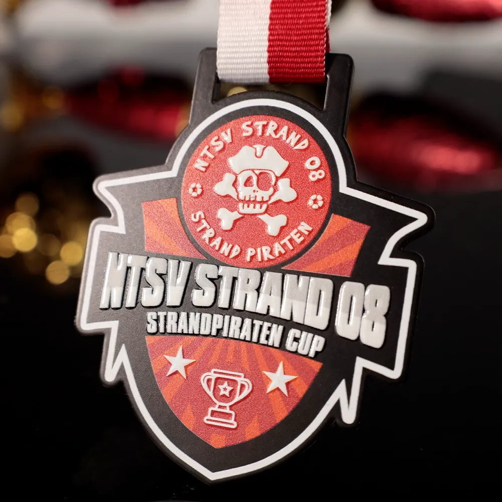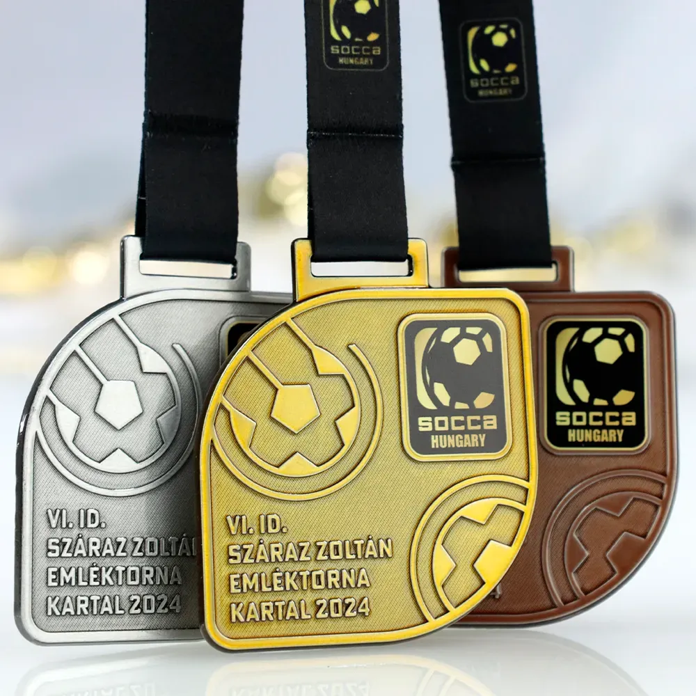 - Custom-made medals (personalised) – These medals are designed specifically for your tournament. The possibilities here are virtually endless: the medal can have a unique shape (e.g. a shield with a club emblem, a 3D football, or even a mini replica of a stadium), and it can incorporate the event logo, a sponsor’s name, or any text you desire. Such medals are created from scratch according to your idea or a concept developed by the manufacturer. While custom medals come at a higher price, they offer an unparalleled uniqueness – participants will feel that they’ve received something truly special, made exclusively for that event. Personalised medals are especially recommended for prestigious tournaments, league finals, or jubilee matches where you want to highlight the importance of the occasion.