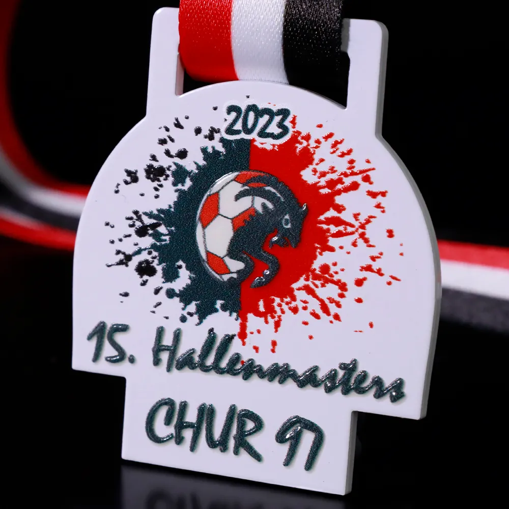An alternative to traditional casting is steel medals with printed designs – these are thinner but durable medals where a full-colour graphic (for example, a club crest or tournament artwork) is printed onto the surface. Another interesting approach is combining materials: a metal medal with elements made of plastic or wood can create a modern and original effect. For instance, a metal medal with a wooden insert shaped like a football highlights an eco-friendly theme in the award.