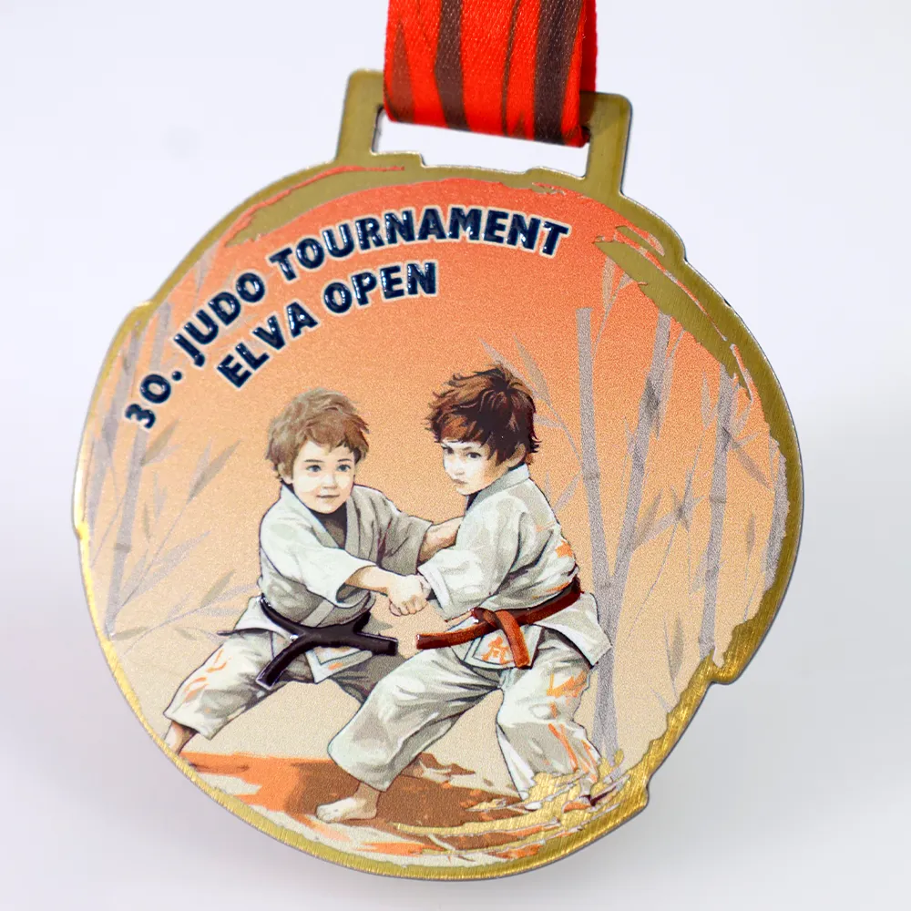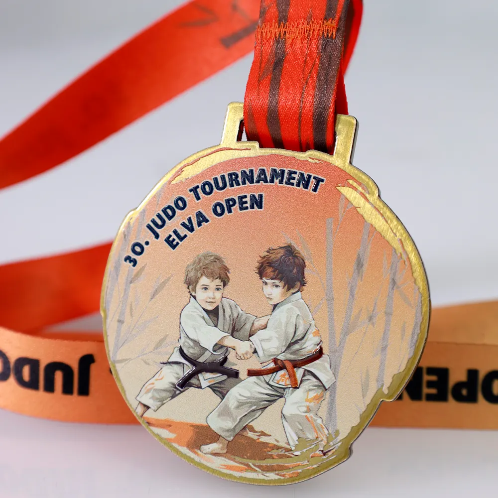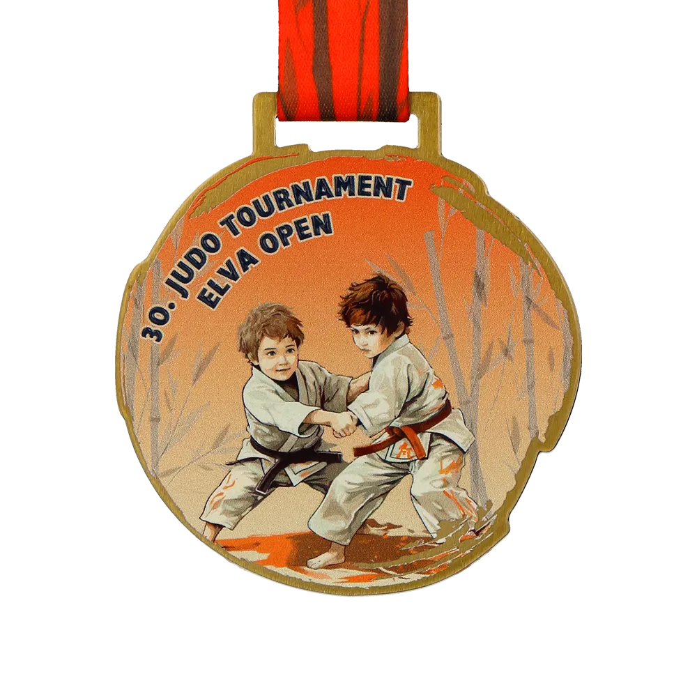 We present a personalized medal created specifically for the 30th Judo Tournament Elva Open. The front of the medal features a colorful image of two young judokas fighting, perfectly capturing the spirit and energy of the tournament.