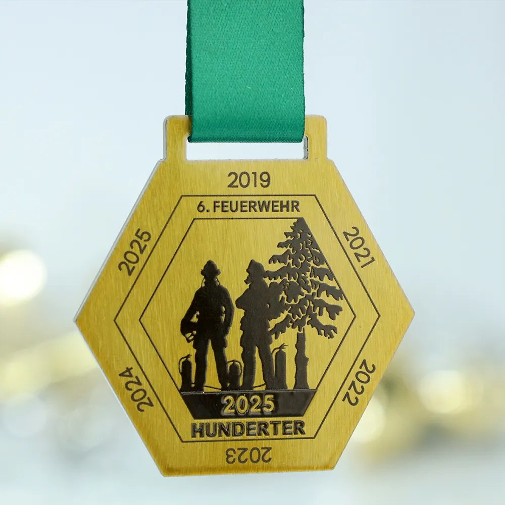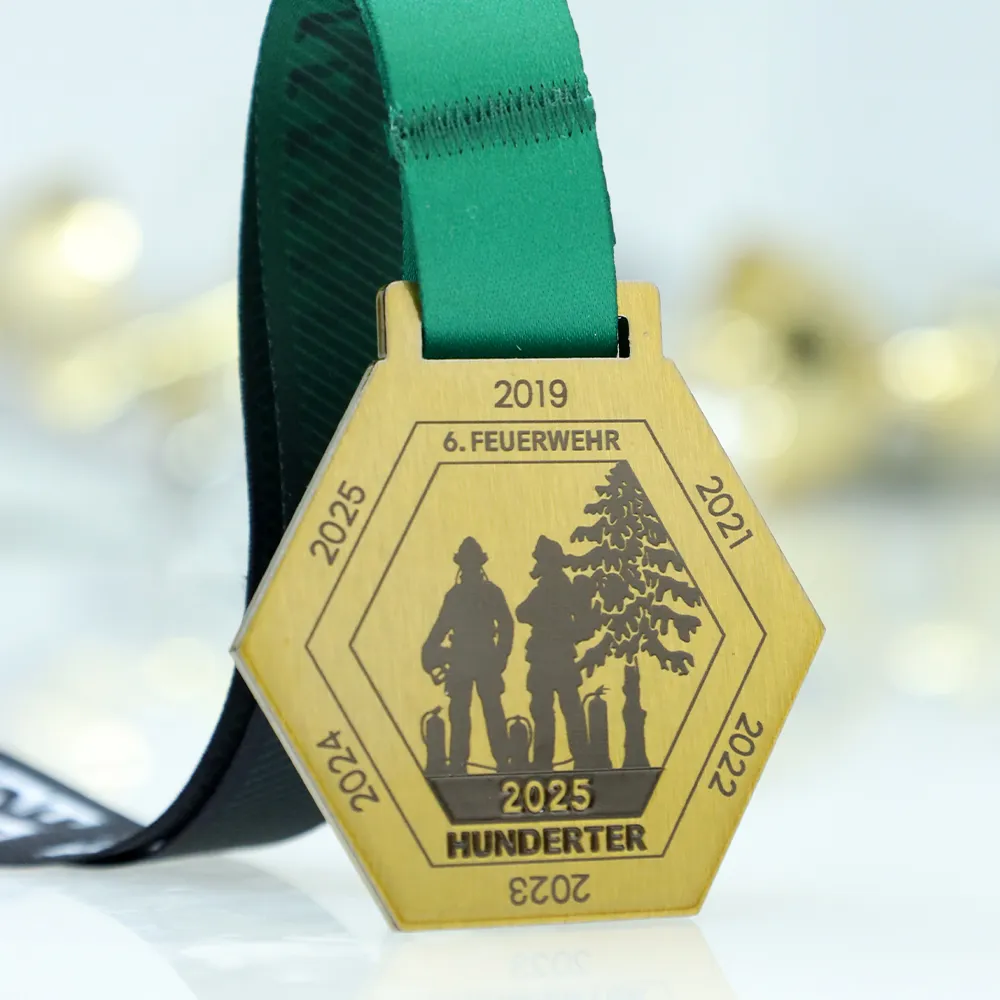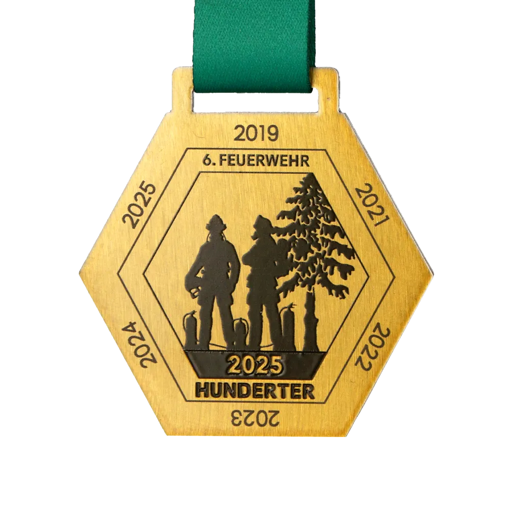 This stylish bespoke medal for the 6. Feuerwehr-Hunderter perfectly combines elegant, gold-colored steel with a modern geometric shape. Sharp graphics made with durable UV printing depict firefighters surrounded by nature, giving the whole piece a professional and thematic character.