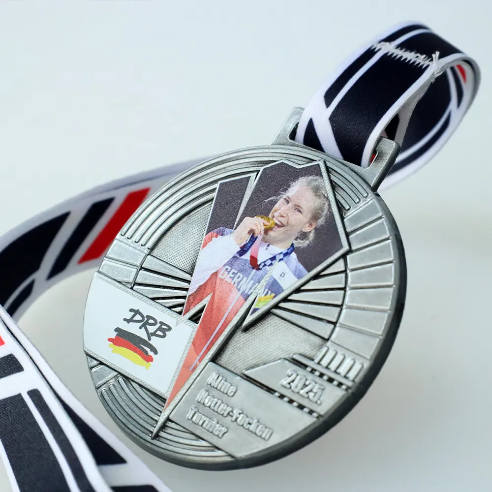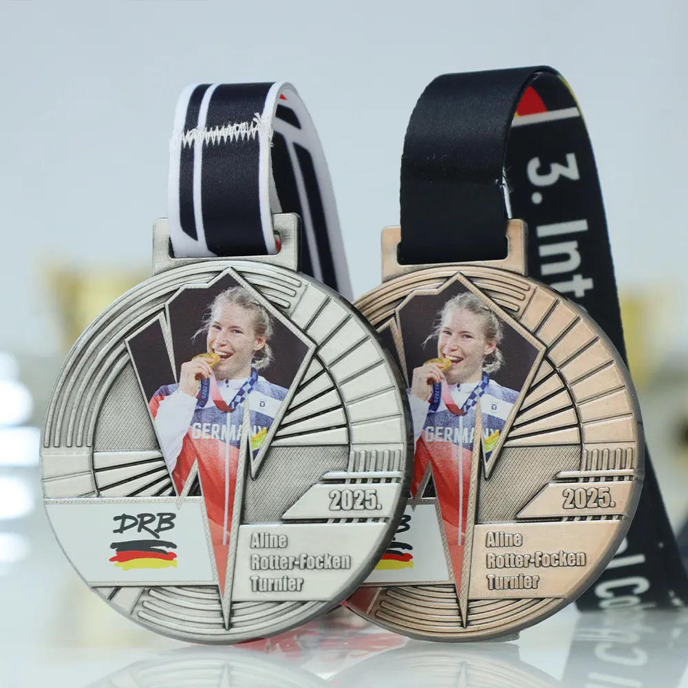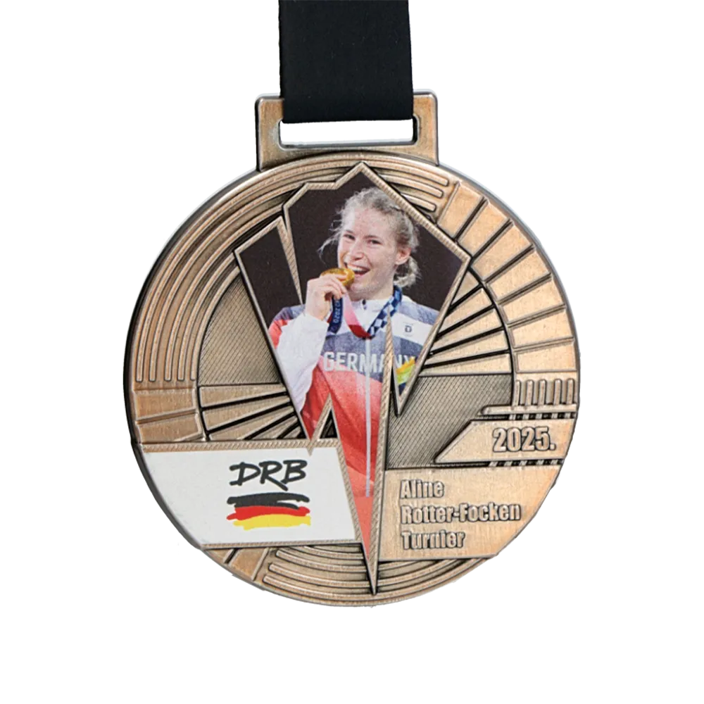 Bespoke medal for Aline Rotter-Focken Turnier 2025 combines a zinc alloy casting with a bronze antique finish and UV printing that places a full-colour photograph of the patron directly onto the relief surface of the disc. The radially arranged geometric relief and central rhomboid panel form the architectural structure of the casting, into which the photograph is precisely integrated. The DRB logo with the German flag, together with relief year and tournament name markings, complete the informational layout — making it an ideal award for an invitational competition bearing the patronage of an Olympic champion.