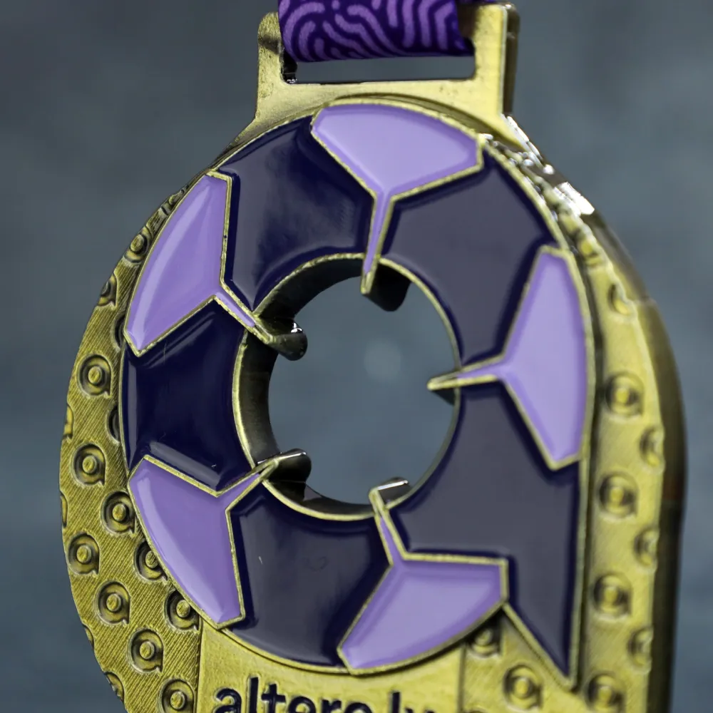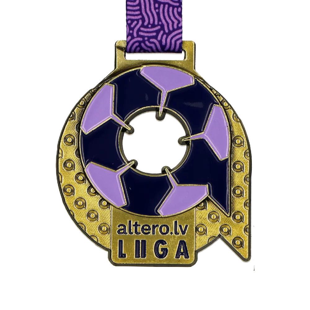 Personalised medal prepared for the Altero.lv Liiga matches. The shape was cast from a mould, with a central cut-out in the form of a football. Decorations in purple, navy, and gold were applied with enamel technique. The medal is intended for participants of the football league.