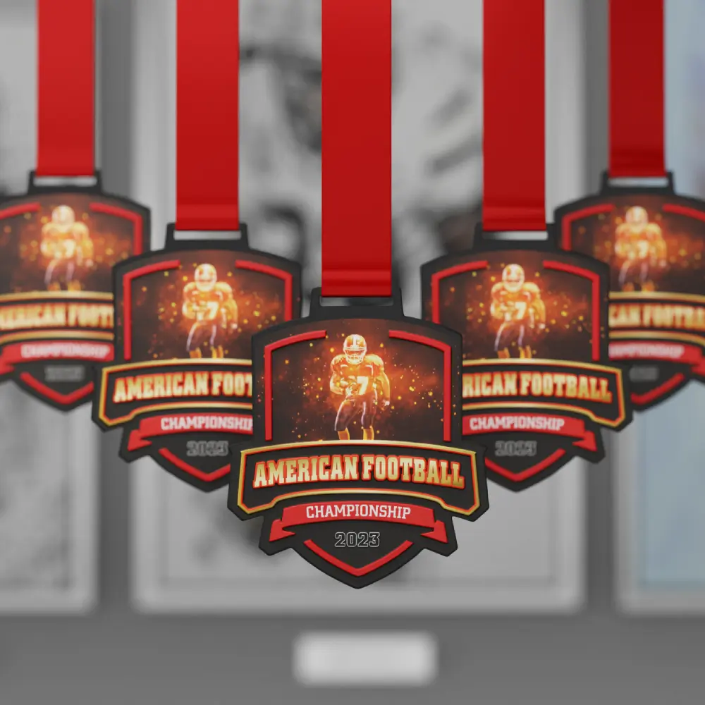 Feel the combative energy of American football with our new medals, which fully capture the rhythm and passion of this sport. These steel medals have been precisely laser-cut and made according to an individual design. What’s more, the awards have an intense, black colour, which is further emphasised by the colourful red print. The robust design, which perfectly complements the character of American football, is completed by the central graphic of an athlete in action. As a result, the awards perfectly reflect the spirit of the sport and are unmistakably associated with the circumstances of their presentation. These American Football Championship Medals are also part of a set that includes a matching metal trophy.