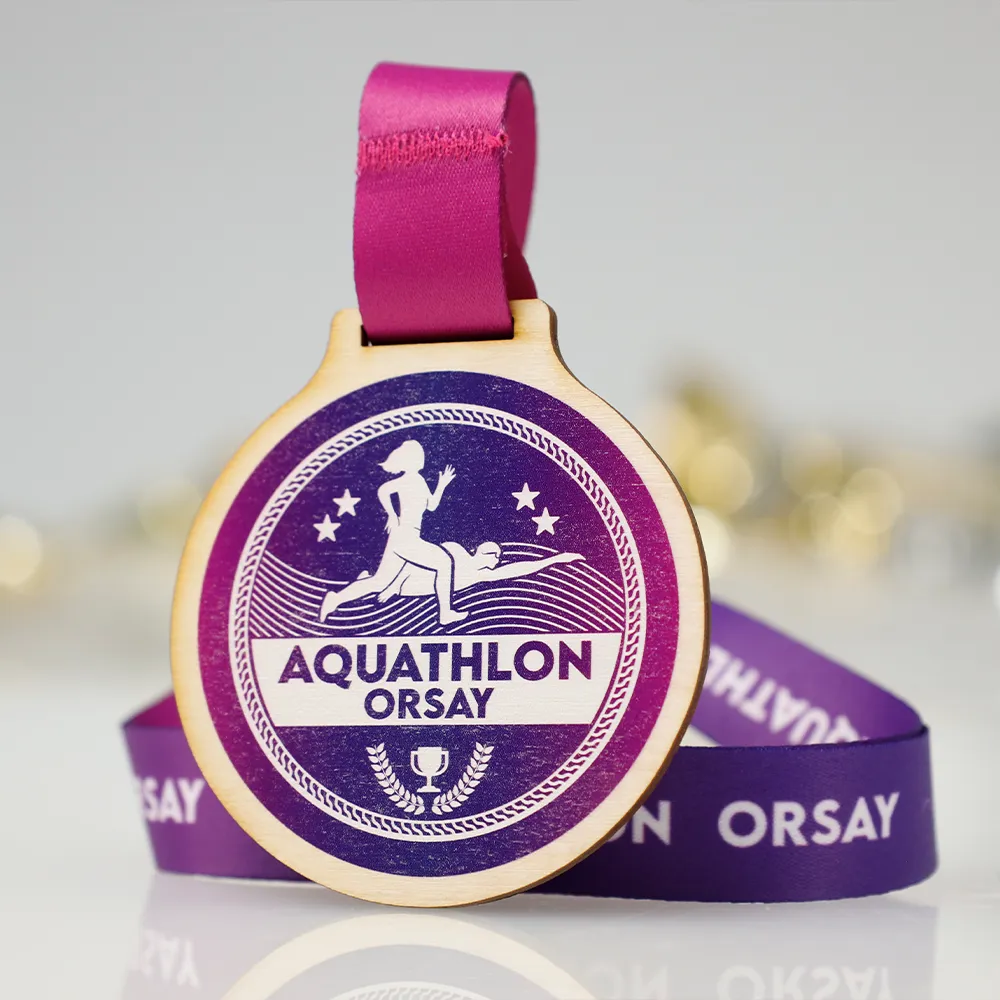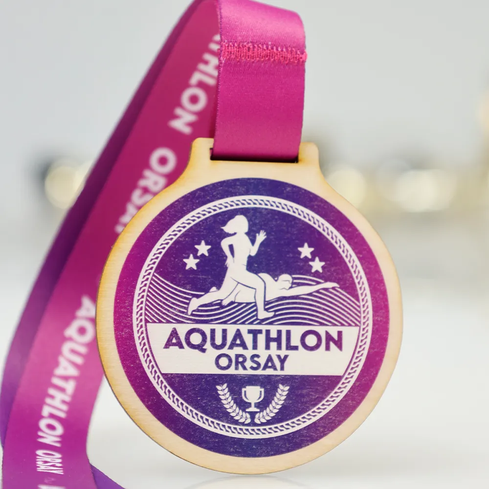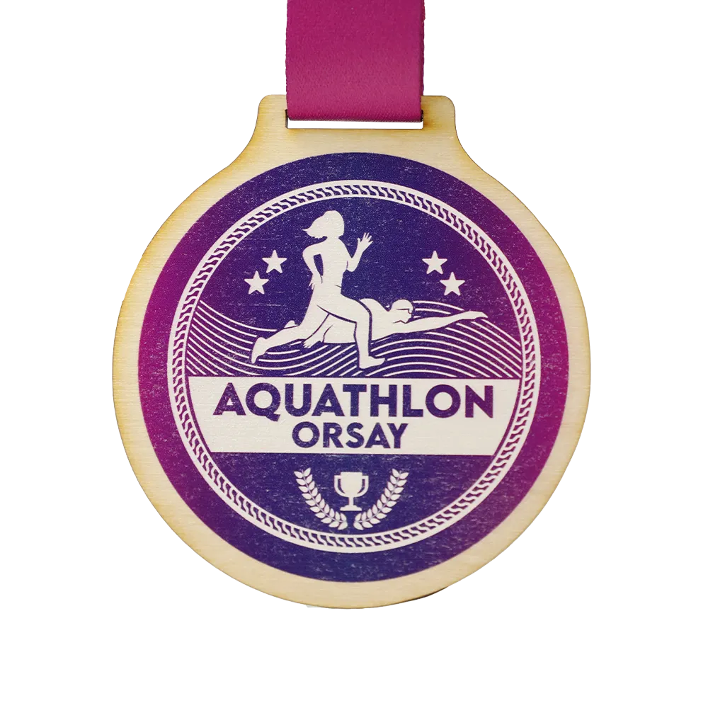 Wooden medal designed for the Orsay Aquathlon event. It is a plywood medal. The front features a striking graphic depicting a runner and a swimmer against a backdrop of waves, along with the event’s name. All the colourful decorations are achieved through durable UV printing.