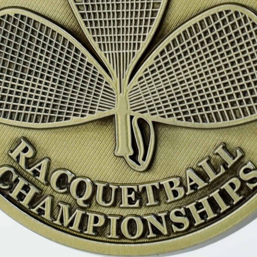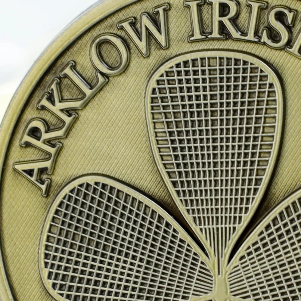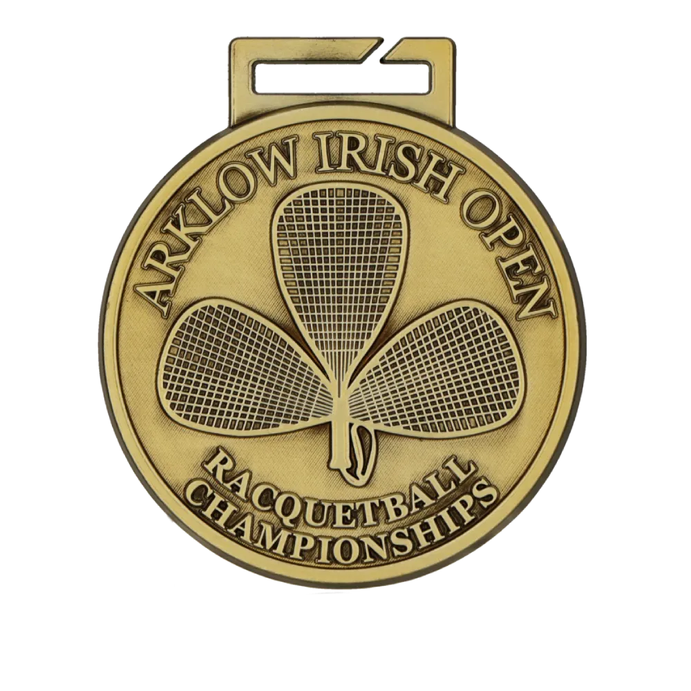 Bespoke sports medals created for Arklow Irish Open Racquetball Championships. Made of metal in gold colour, featuring a three-leaf clover motif formed from racquetball rackets as the central element. The inscriptions are precisely cast on the surface, giving the bespoke medals an elegant and distinctive appearance.