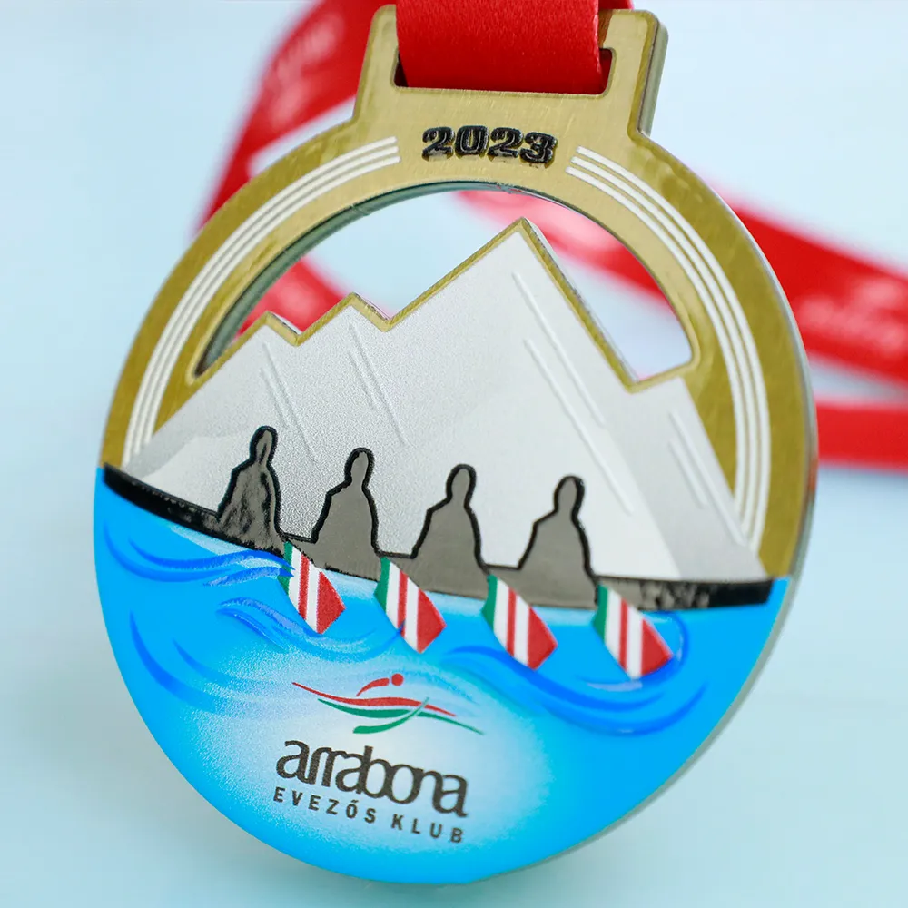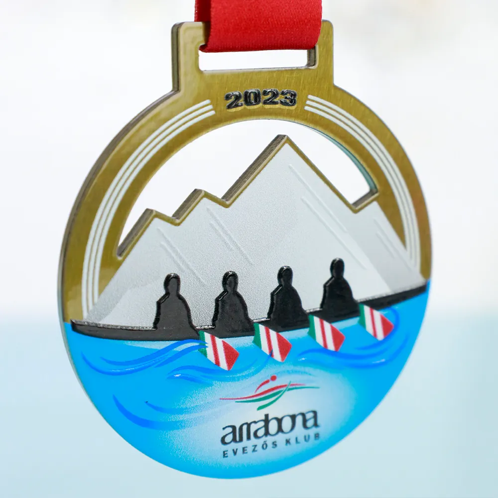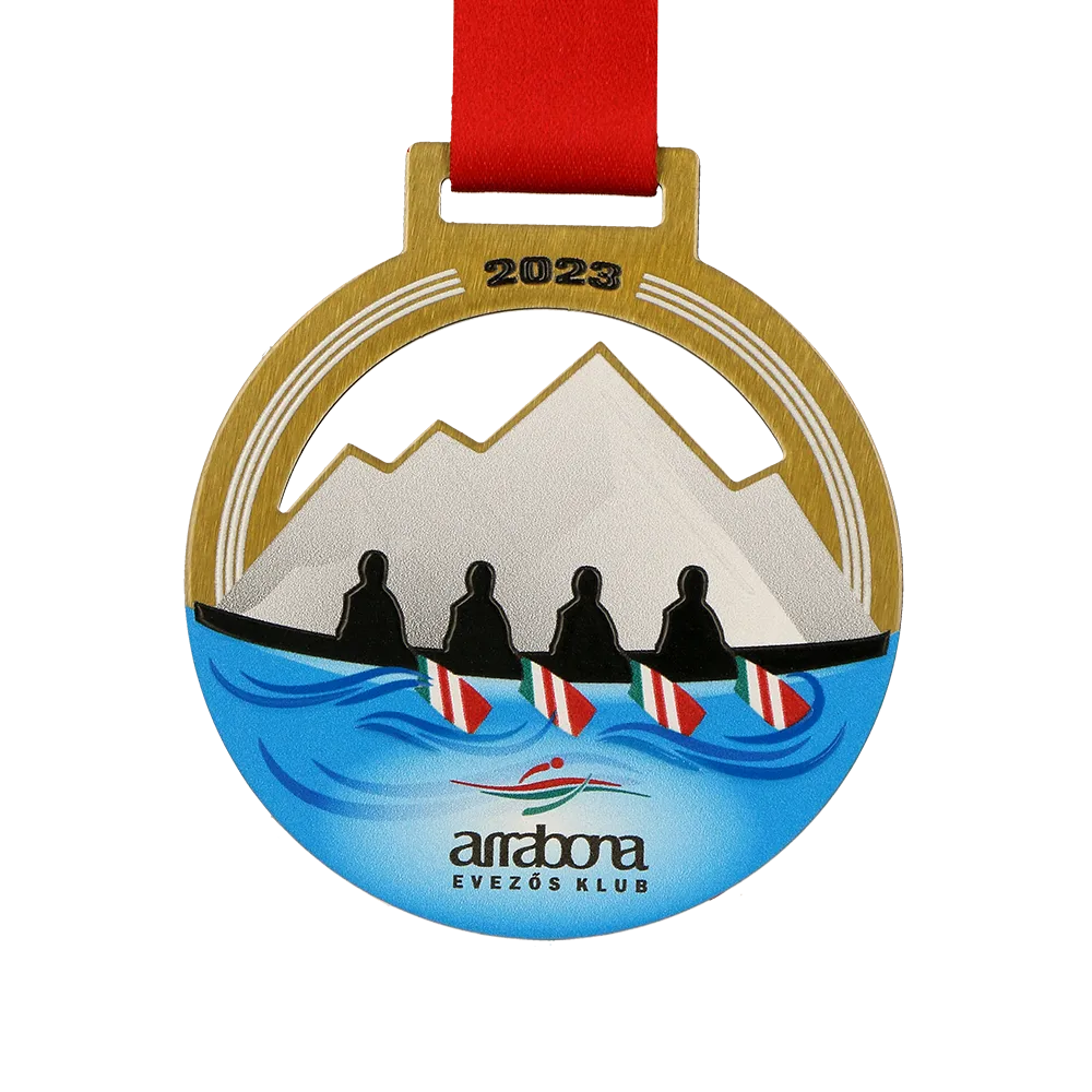 A custom medal created for the Arrabona Evezős Klub. A gold-coloured medal adorned with beautifully rendered silhouettes of rowers against a backdrop of mountains and blue waves.