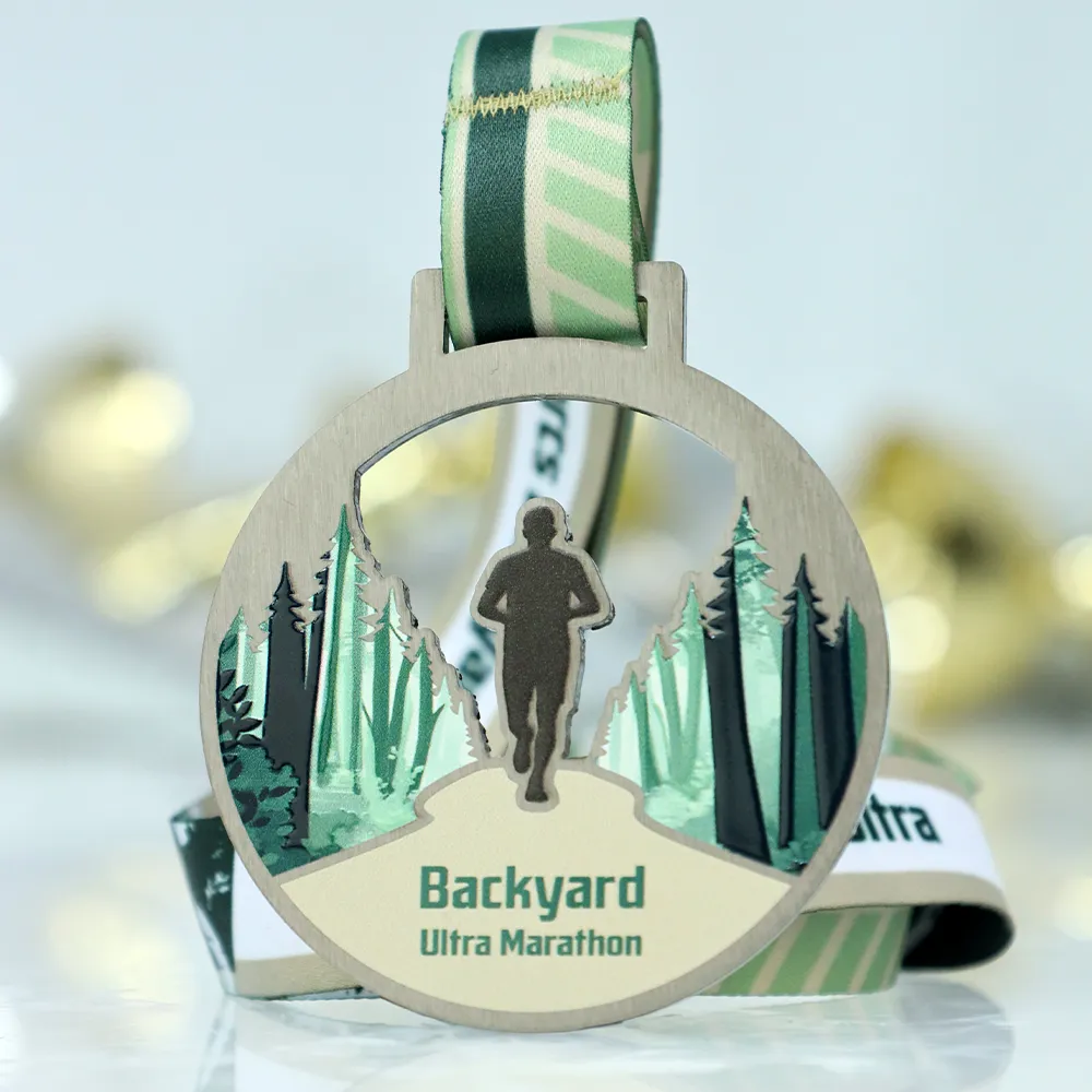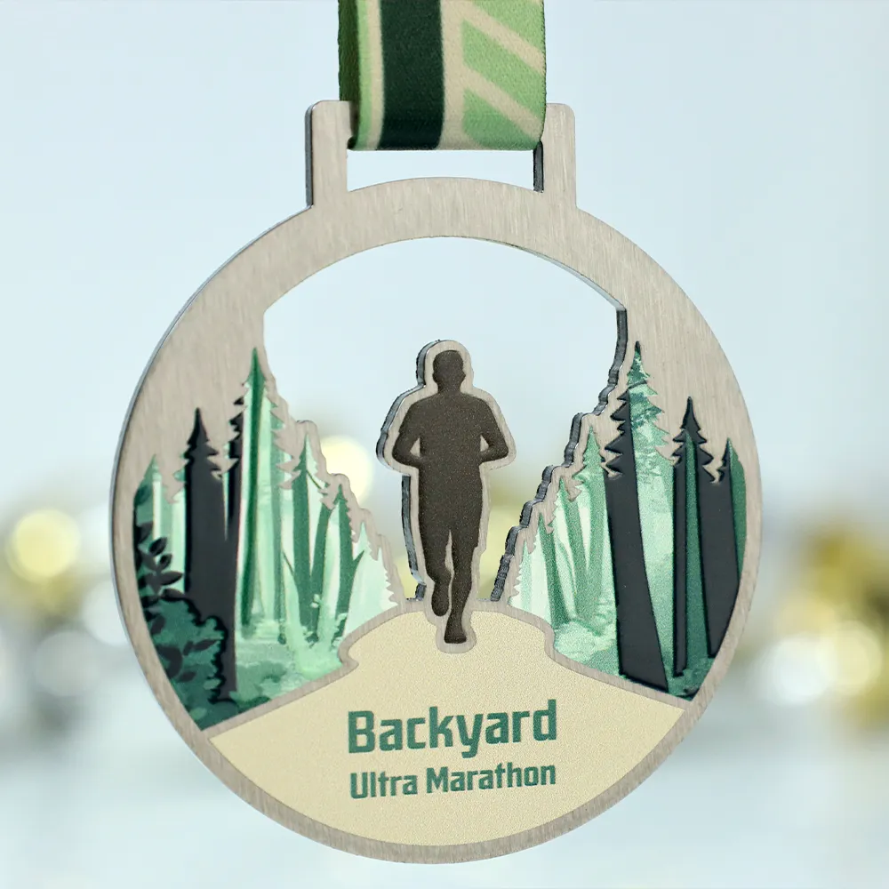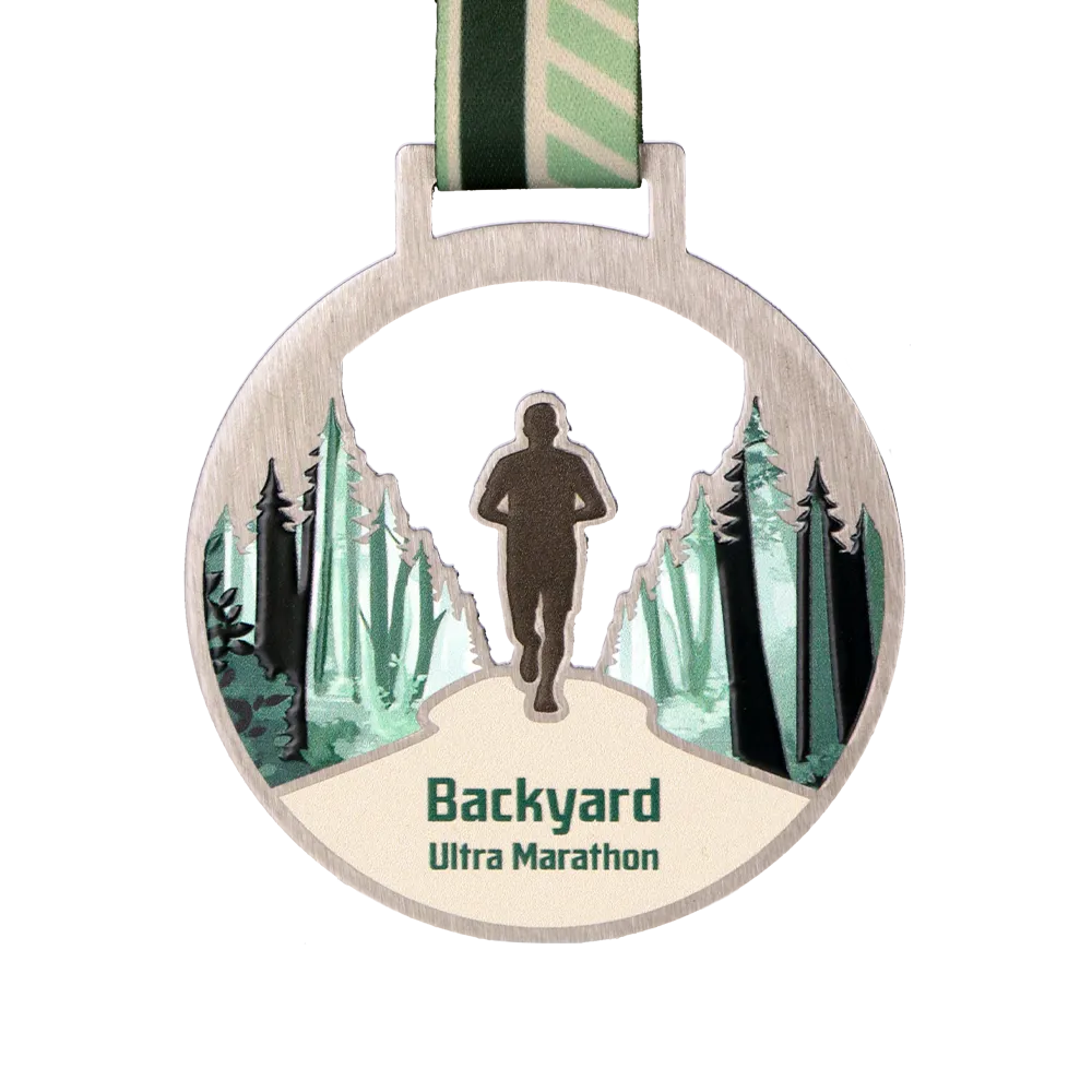 We designed these running medals specifically for the Backyard Ultra Marathon, combining the raw appeal of steel with natural motifs. The round shape with an artistic cut-out in the upper part showcases forest graphics and a runner's silhouette, created using UV printing technology. Subdued colors of green and beige perfectly fit the off-road character of the event.