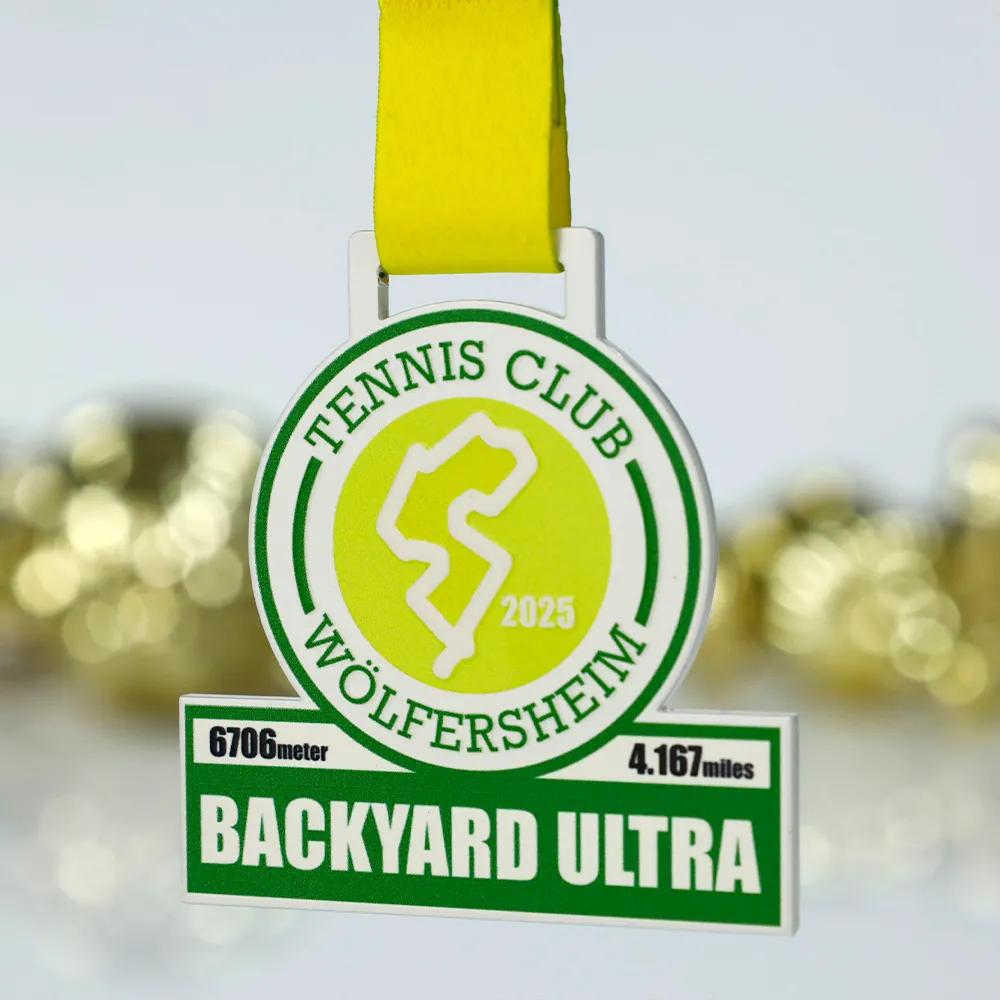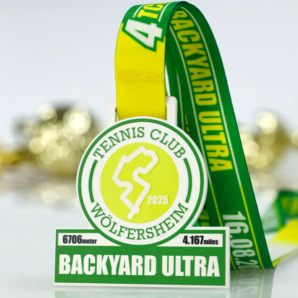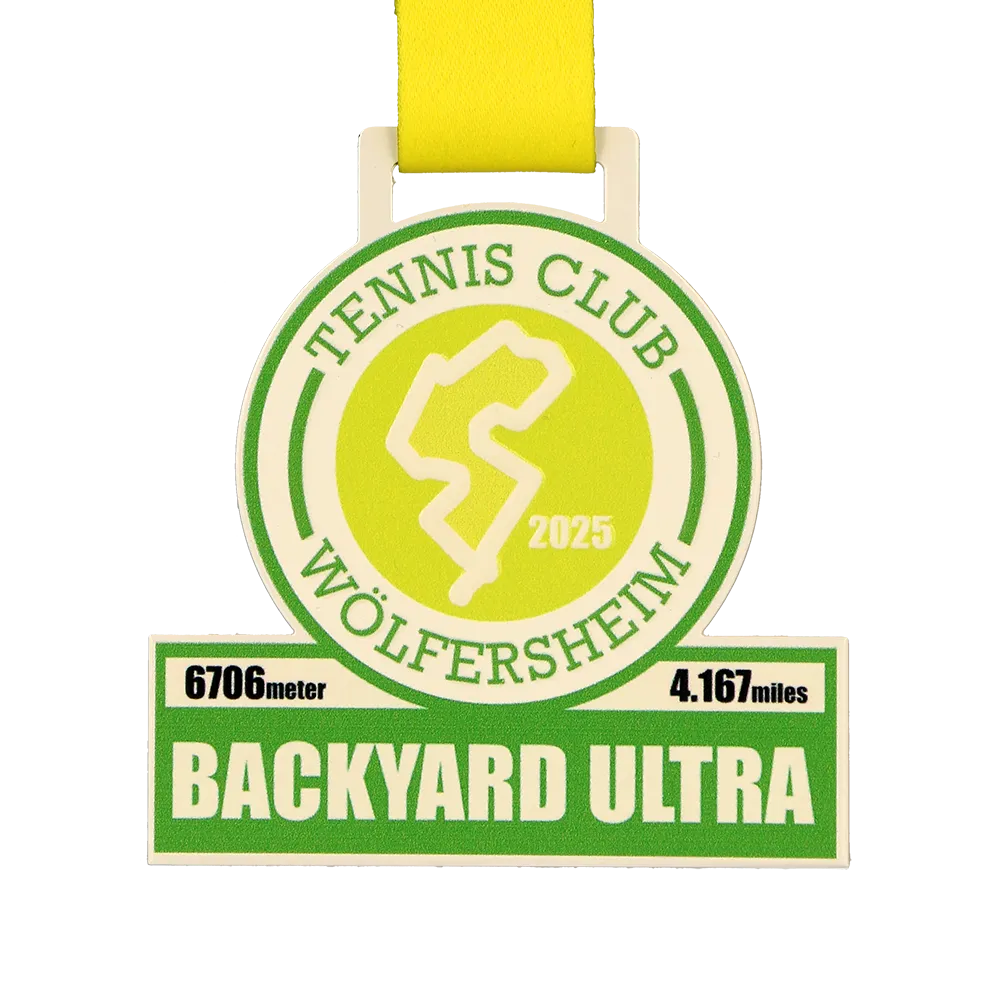 Bespoke medal created for participants of the Backyard Ultra run organised by Tennis Club Wölfersheim in 2025. The medal stands out with a green and yellow colour scheme, a printed course map, and bold lettering. A practical medal for ultramarathon fans.
