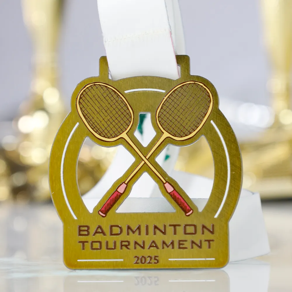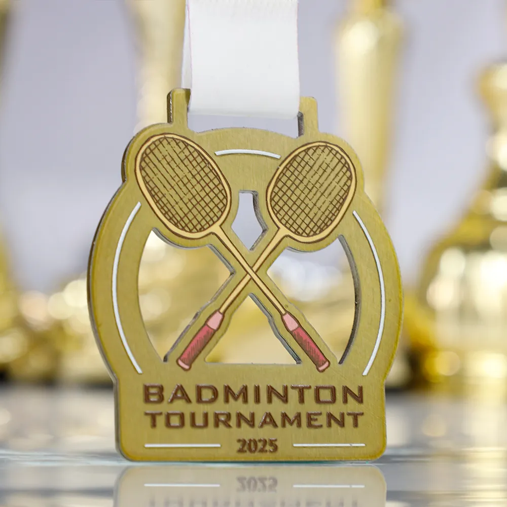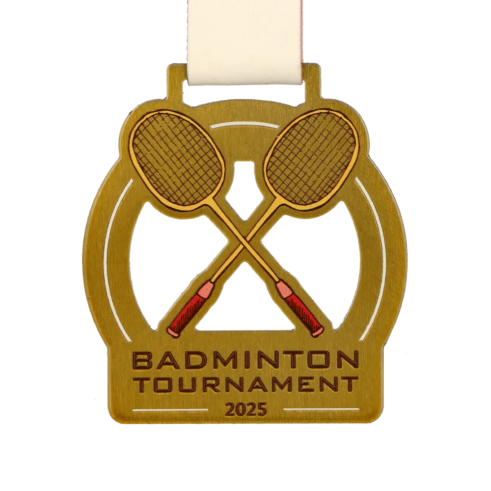 Personalised medal prepared for the 2025 badminton tournament. An elegant motif of two crossed badminton rackets in gold shades with red details. The medal includes the event name and year. The design is completed with a light, solid ribbon.