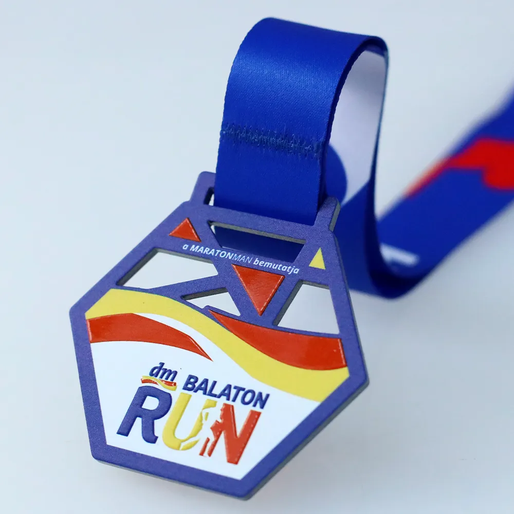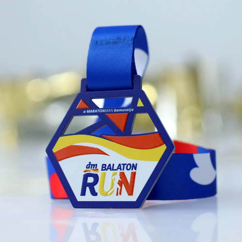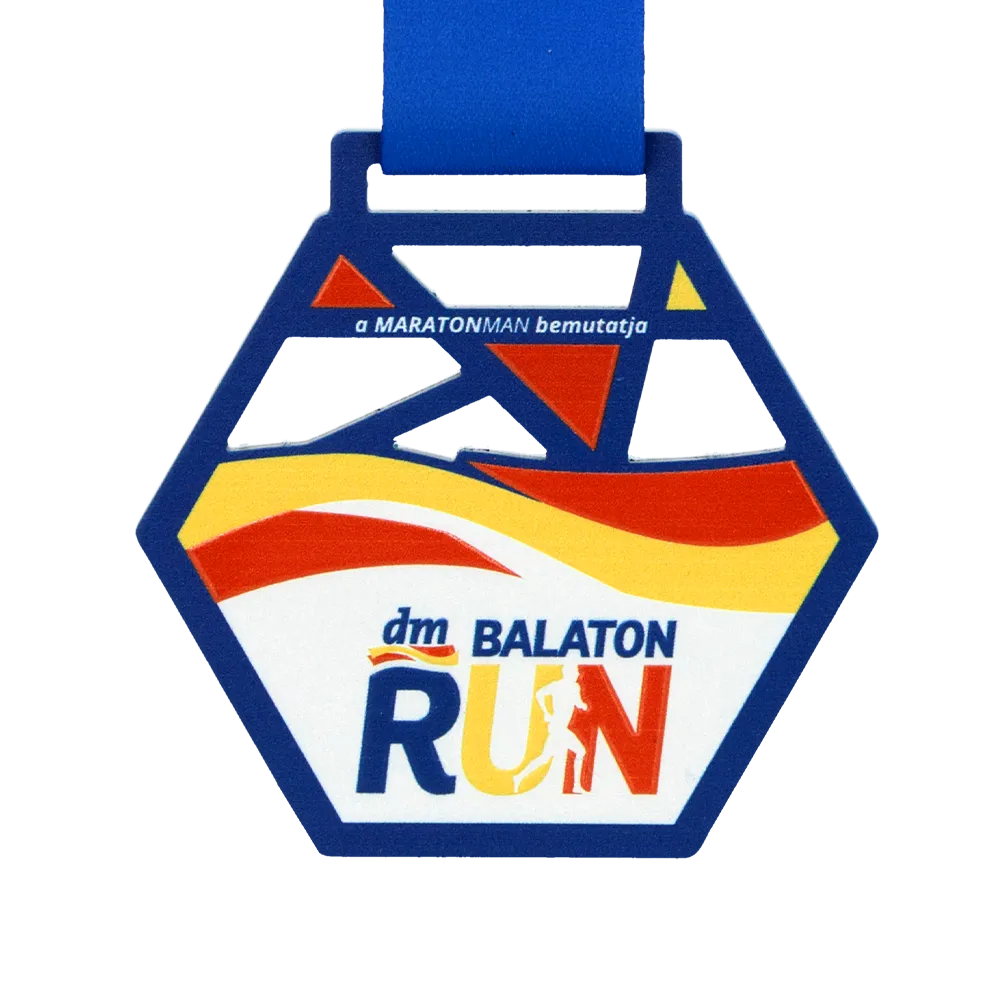 Bespoke medal for Balaton RUN 2025 — a laser-cut hexagonal steel disc with openwork triangular cutouts in the upper section, lending the piece a sense of structural lightness. UV printing divides the surface into three distinct zones: geometric triangles on a blue background, dynamic waves in red and yellow, and a white panel bearing the official dm Balaton RUN logo.