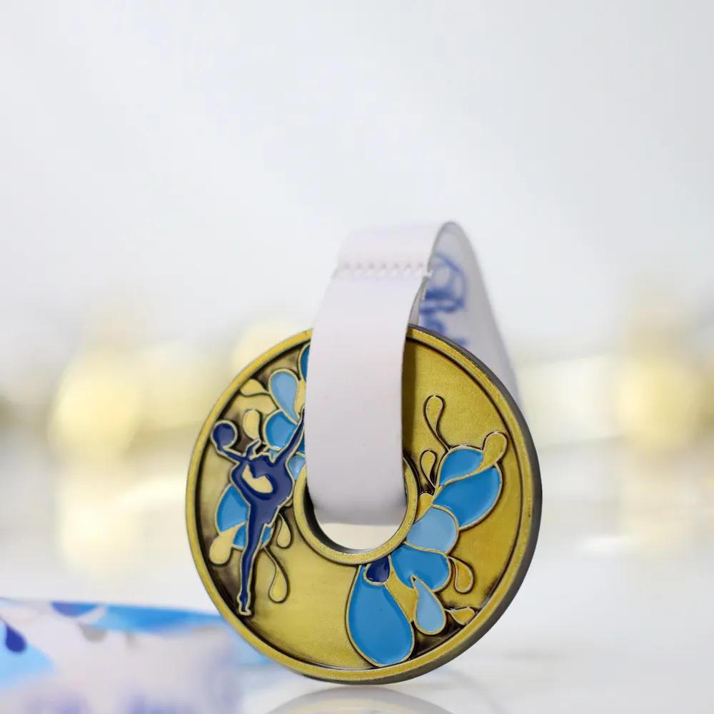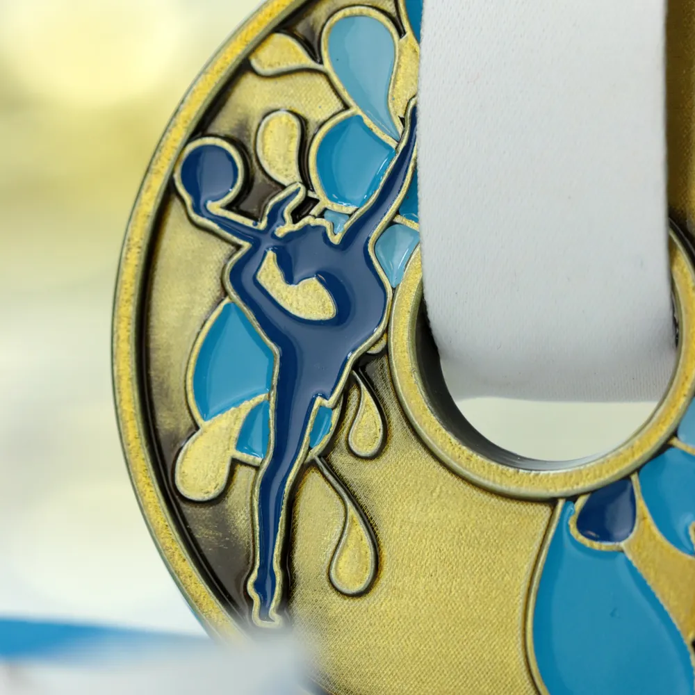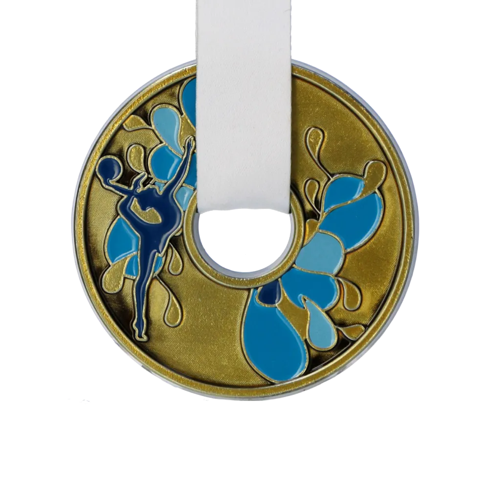 Bespoke medals for Baltic Flower 2025 are crafted from die-cast zamak, ensuring every fine detail—from the dancer’s elegant silhouette to the delicate water droplets—is sharp and enduring. Vibrant navy and blue enamel accents provide a stunning contrast against the gold backdrop, making this medal a real head-turner. Its circular form, featuring a central cut-out and a sleek silver rim, delivers a truly contemporary aesthetic.