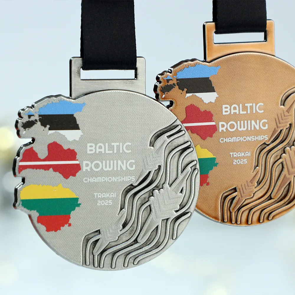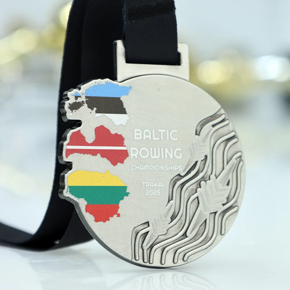 This precisely executed custom medal is a masterful combination of durable Zinc Alloy and modern decoration methods. The three-dimensional, tactile texture of choppy water and oars was achieved through the die-casting process, contrasting perfectly with the smooth surface of the maps finished with UV printing technique. This technology allowed for a faithful reproduction of the Estonian, Latvian, and Lithuanian flags with sharp edges, making this trophy for the Baltic Rowing Championships a prime example of top-quality craftsmanship.