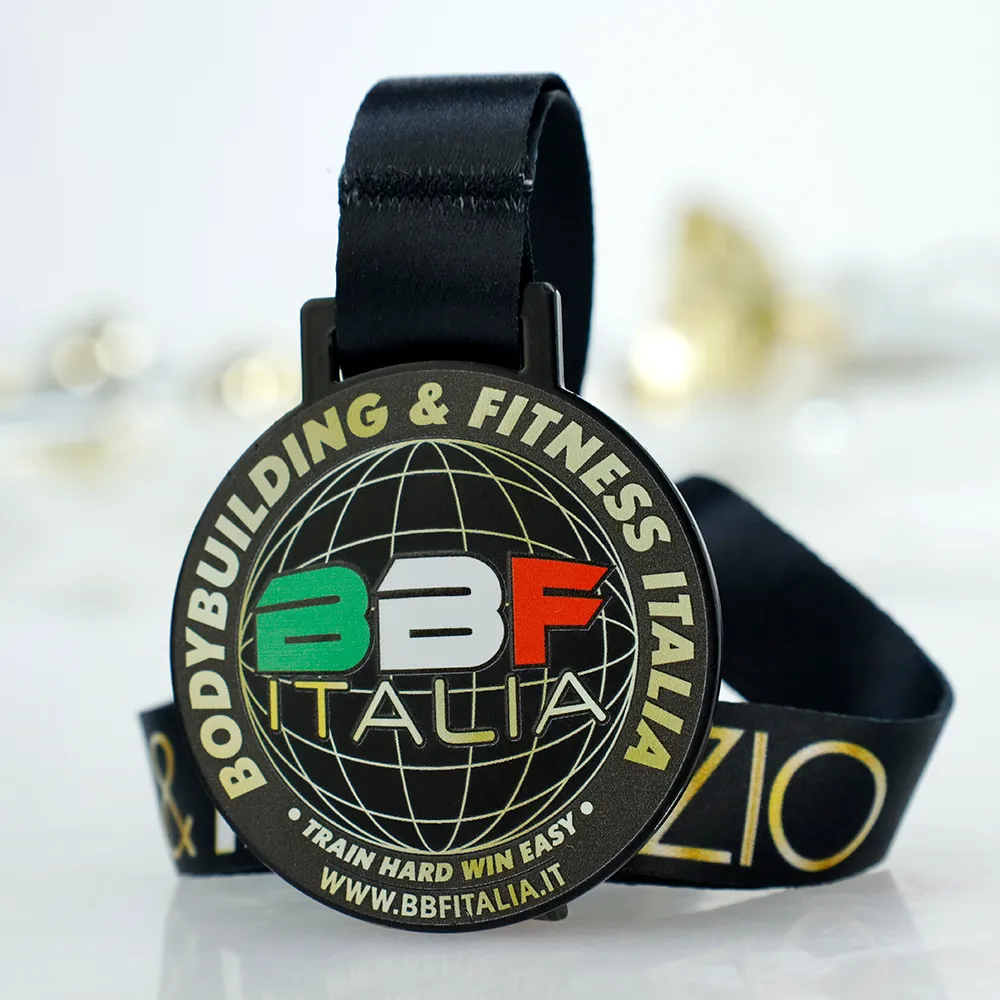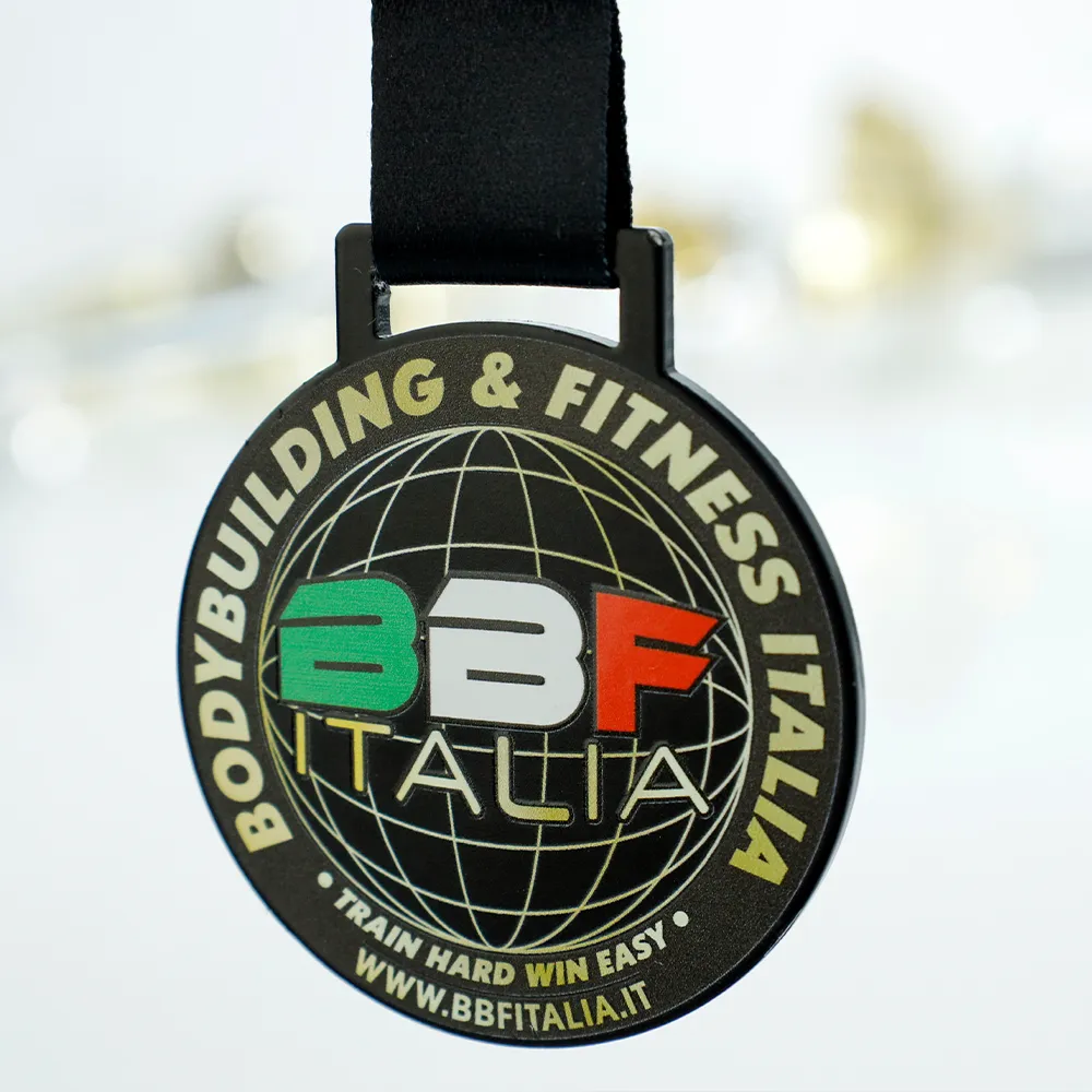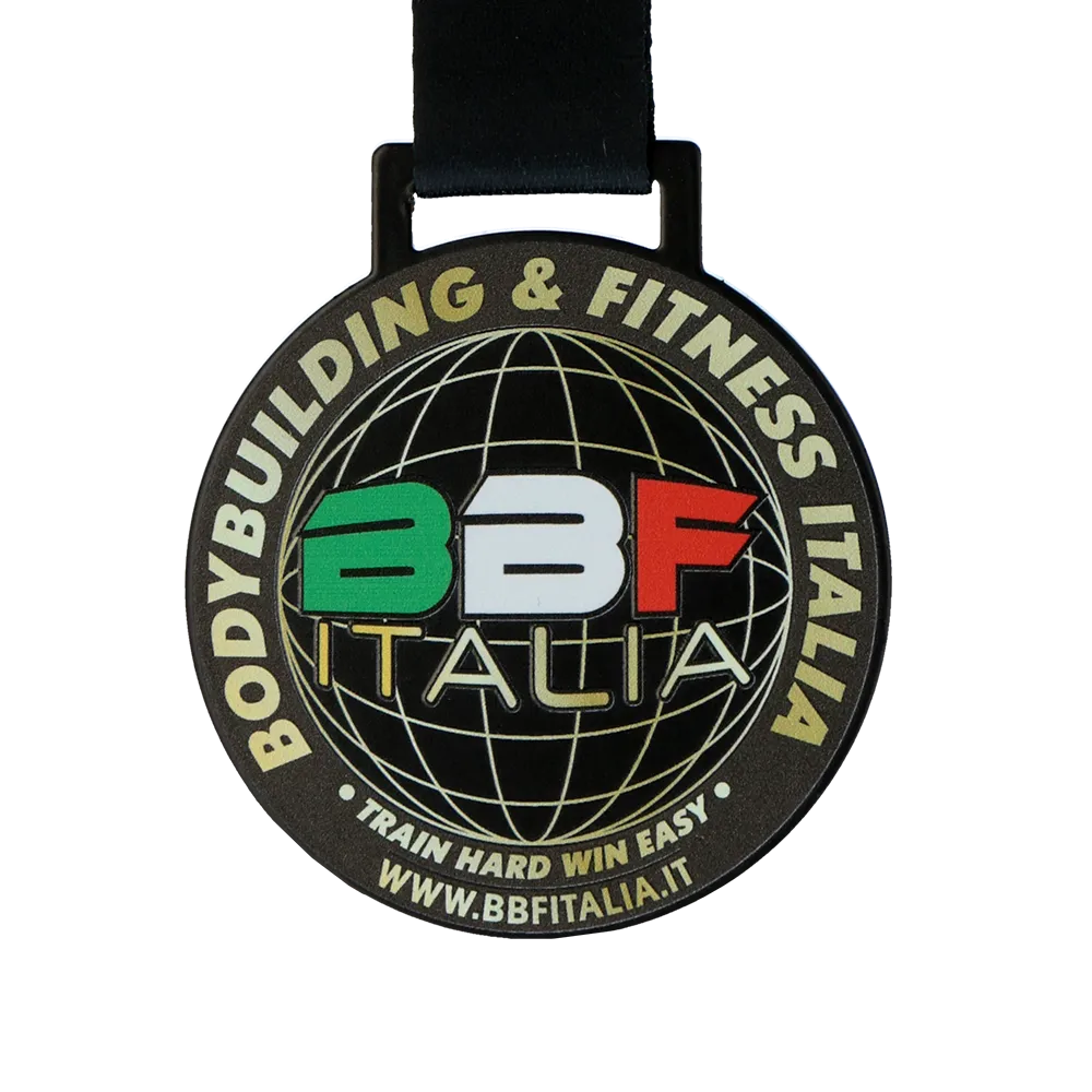 This steel medal with UV print was designed for BBF Bodybuilding & Fitness Italia. It has a classic circular form with a black background. The obverse UV print features the federation logo over a globe, in the colours of the Italian flag. The surrounding legend and motivational slogan are rendered in gold.
