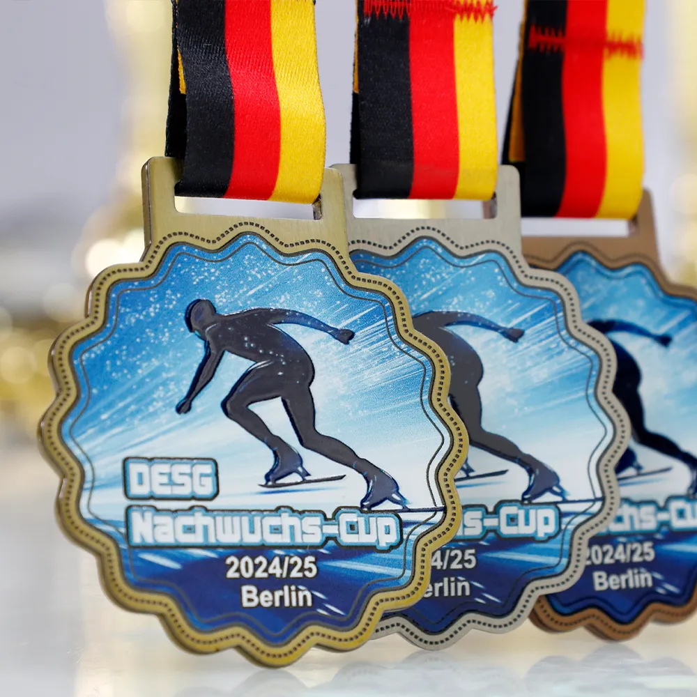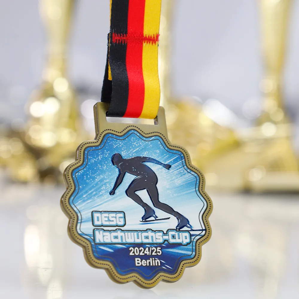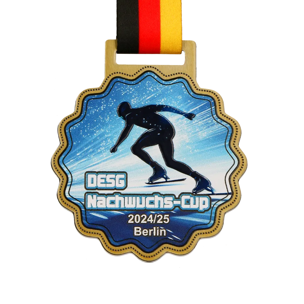 A steel personalised medal created for the ice skating tournament “DESG Nachwuchs-Cup 2024/25” in Berlin. It stands out with its blue background and a dynamic image of an athlete, made using UV printing technology. The gold edge adds elegance, and the inscriptions precisely specify the name of the competition and its edition. The medal is complemented by a classic, tricolour ribbon in the colours of Germany.