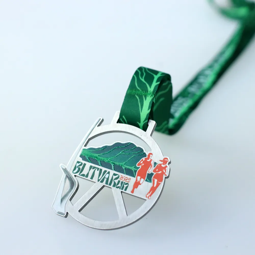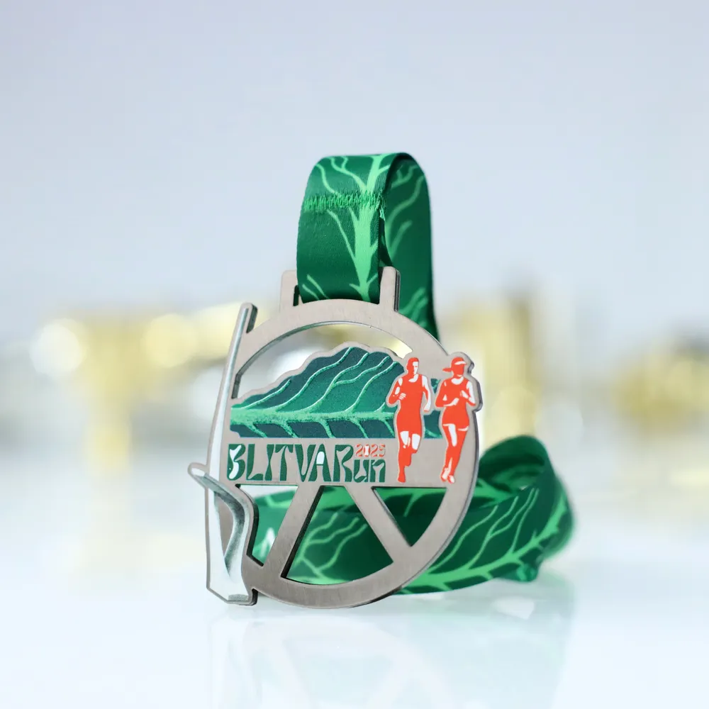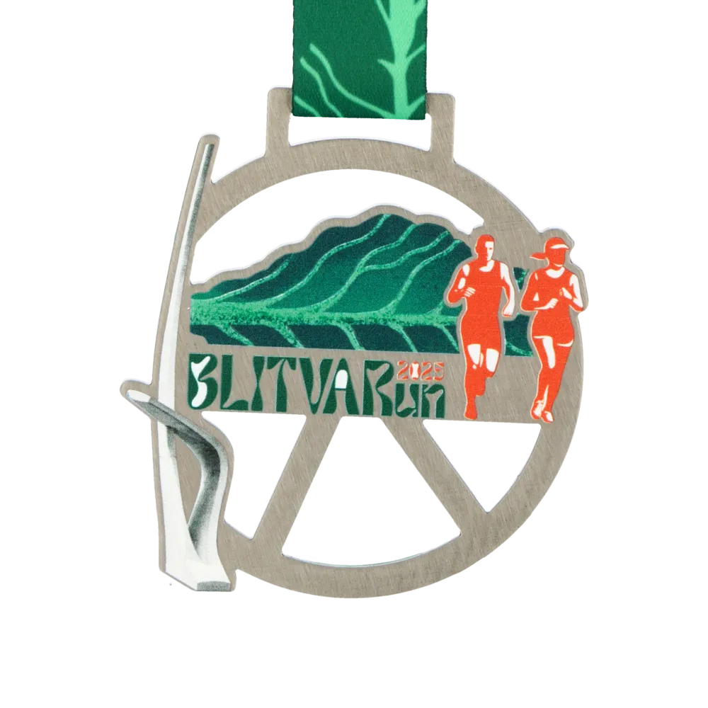 Blitva Run 2025 running medals are made from steel, featuring a unique, irregular shape with precise laser-cut apertures. The silver surface is enhanced with a full-colour UV-printed landscape, showcasing rolling green hills, dwo energetic orange runners, and the event’s branding in stunning detail.