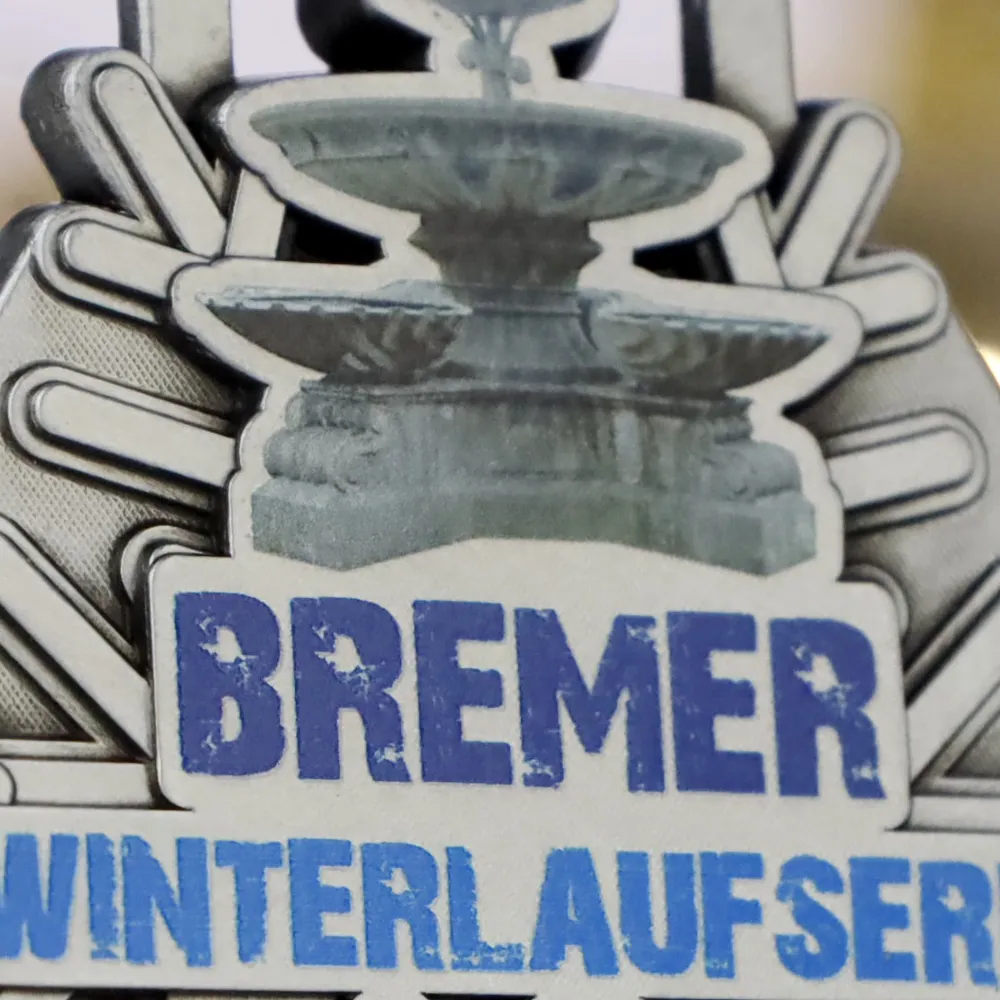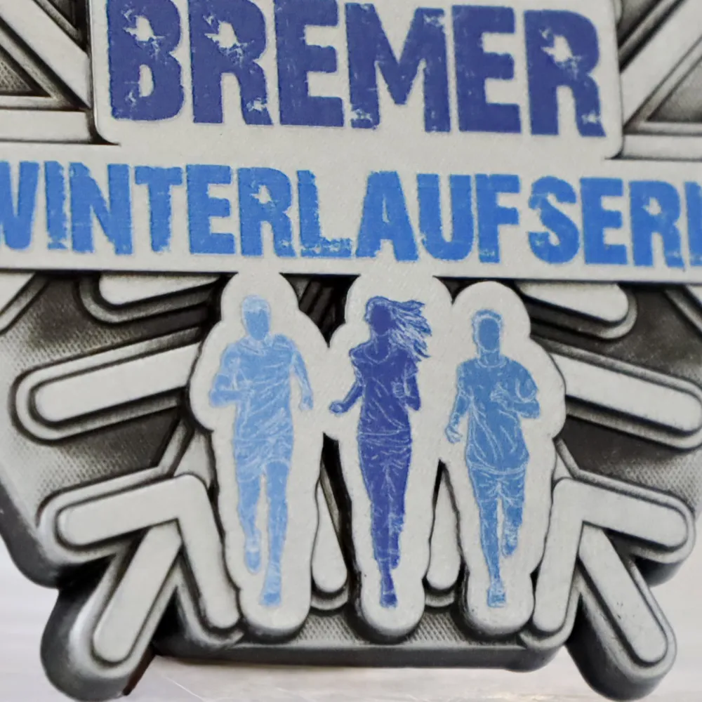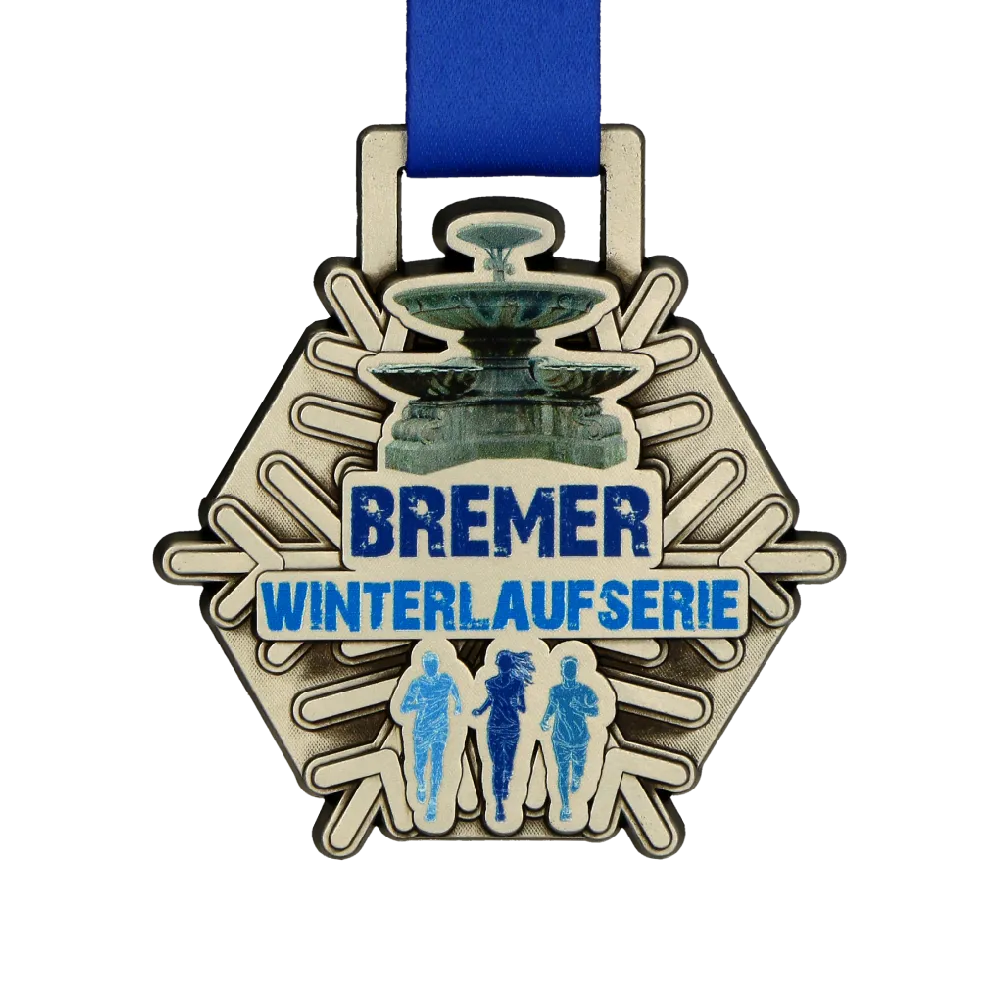 Bespoke medal created for the winter running series Bremer Winterlaufserie. It stands out with a unique hexagonal shape featuring a central snowflake motif, complemented by UV printing in shades of blue, depicting runner silhouettes.
