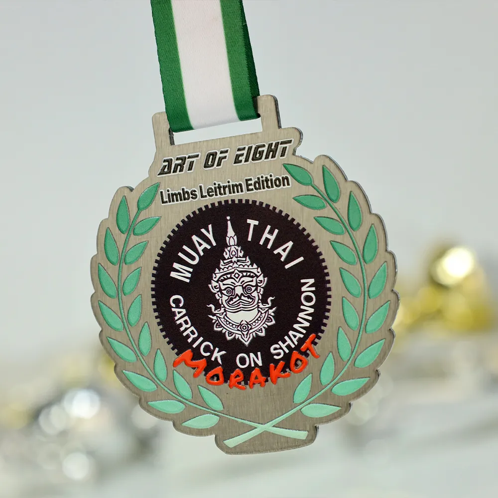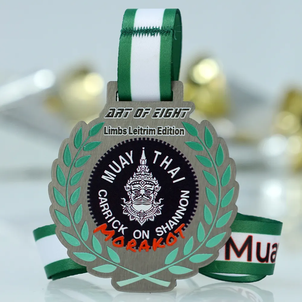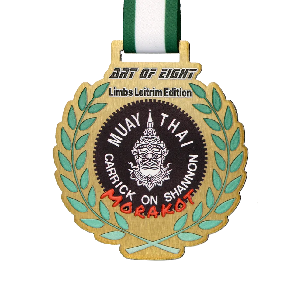 Here is a professional printed steel medal, created for the Carrick On Shannon Muay-Thai gala, combining sporting elegance with the rawness of martial arts. Durable metal serves as the base for the design, where a laser-cut shape creates an impressive, openwork wreath form surrounding the central logo. Colourful UV printing precisely captures the graphic details and the event name, creating a cohesive and eye-catching composition in shades of gold, green, and black.