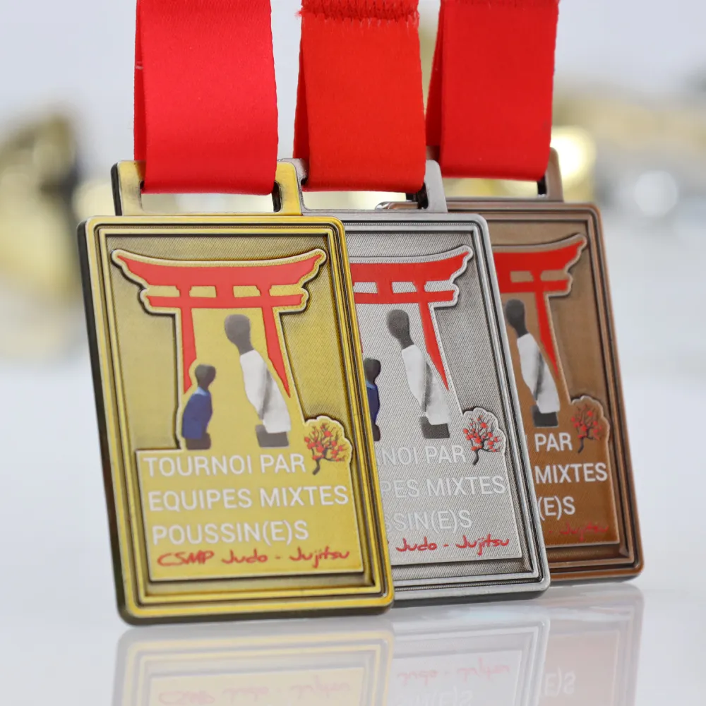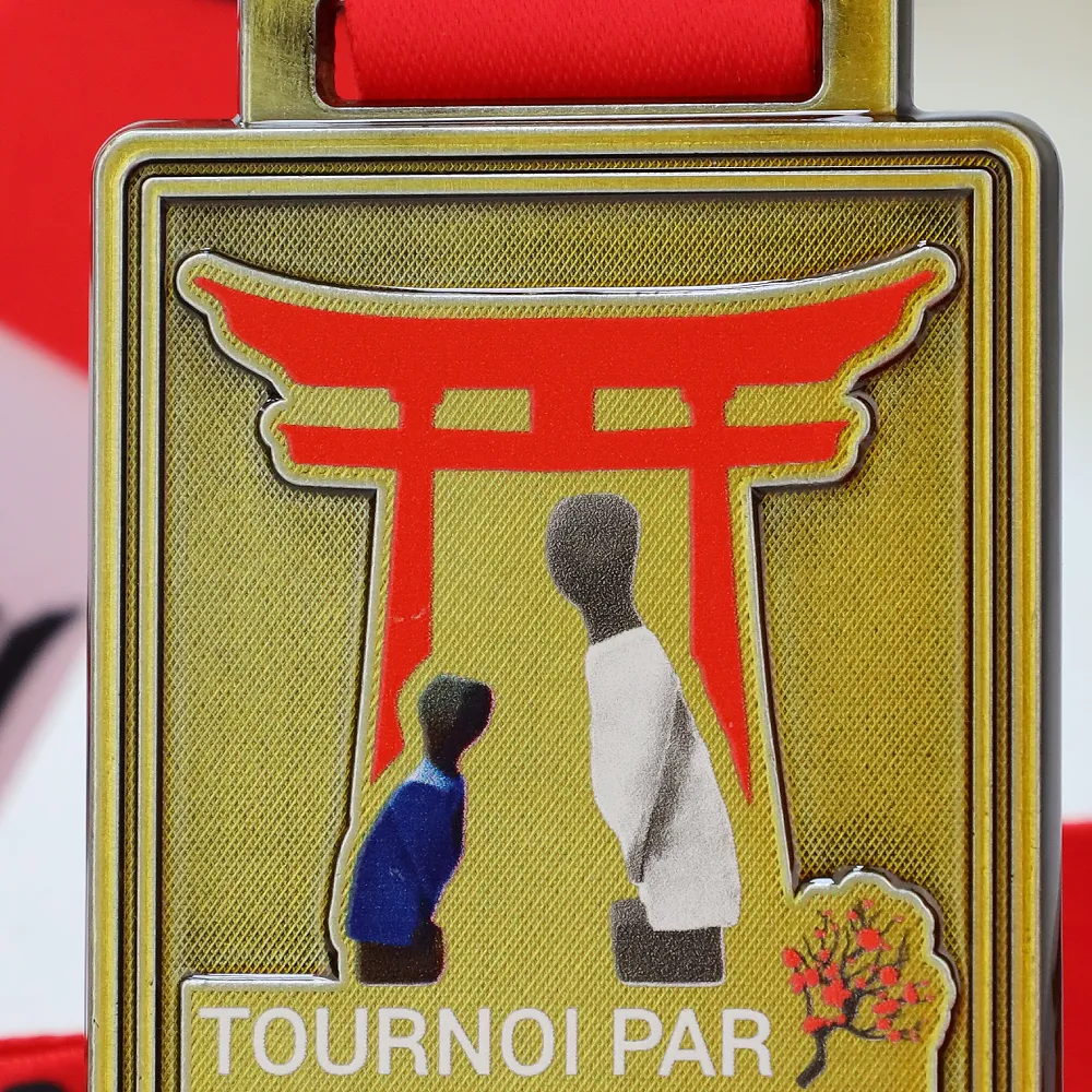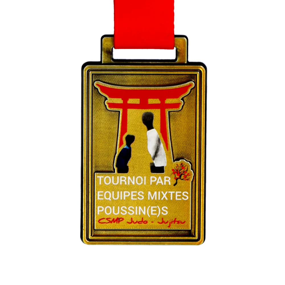 A custom medal designed for the judo tournament for children – “Tournoi par équipes mixtes Poussin(e)s”. This is an antique gold-coloured casting with graphics applied using colourful UV printing. The design features a Japanese torii gate and two competitors bowing to each other. The medal hangs on a red ribbon matching the design’s colour scheme.