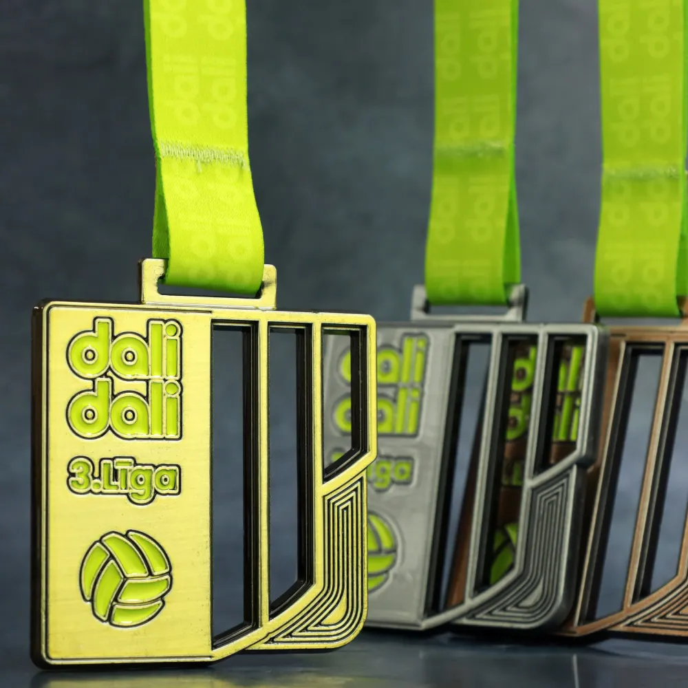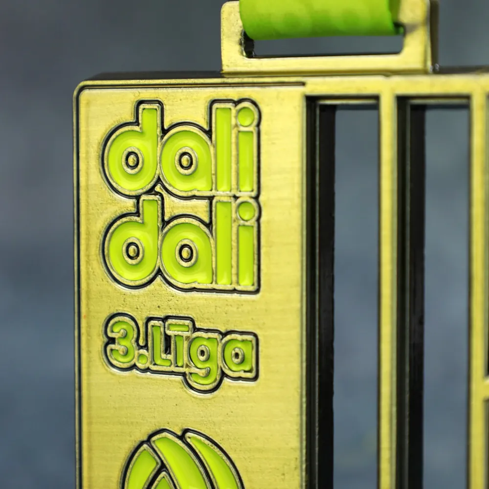 Bespoke medal prepared for the Dali Dali 3rd League matches. The shape was cast from a mould in the form of a rectangle with open elements. Decorations in yellow were applied with enamel technique. The medal is intended for participants of the football league.