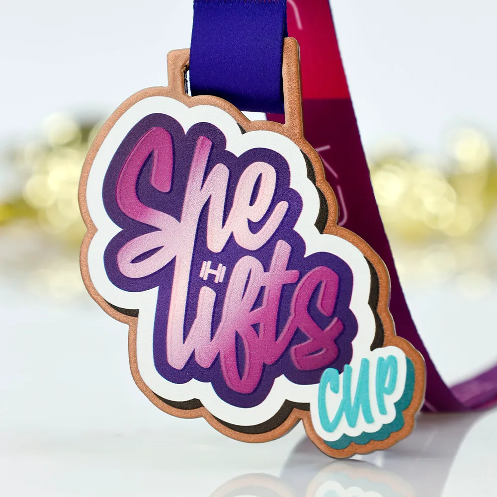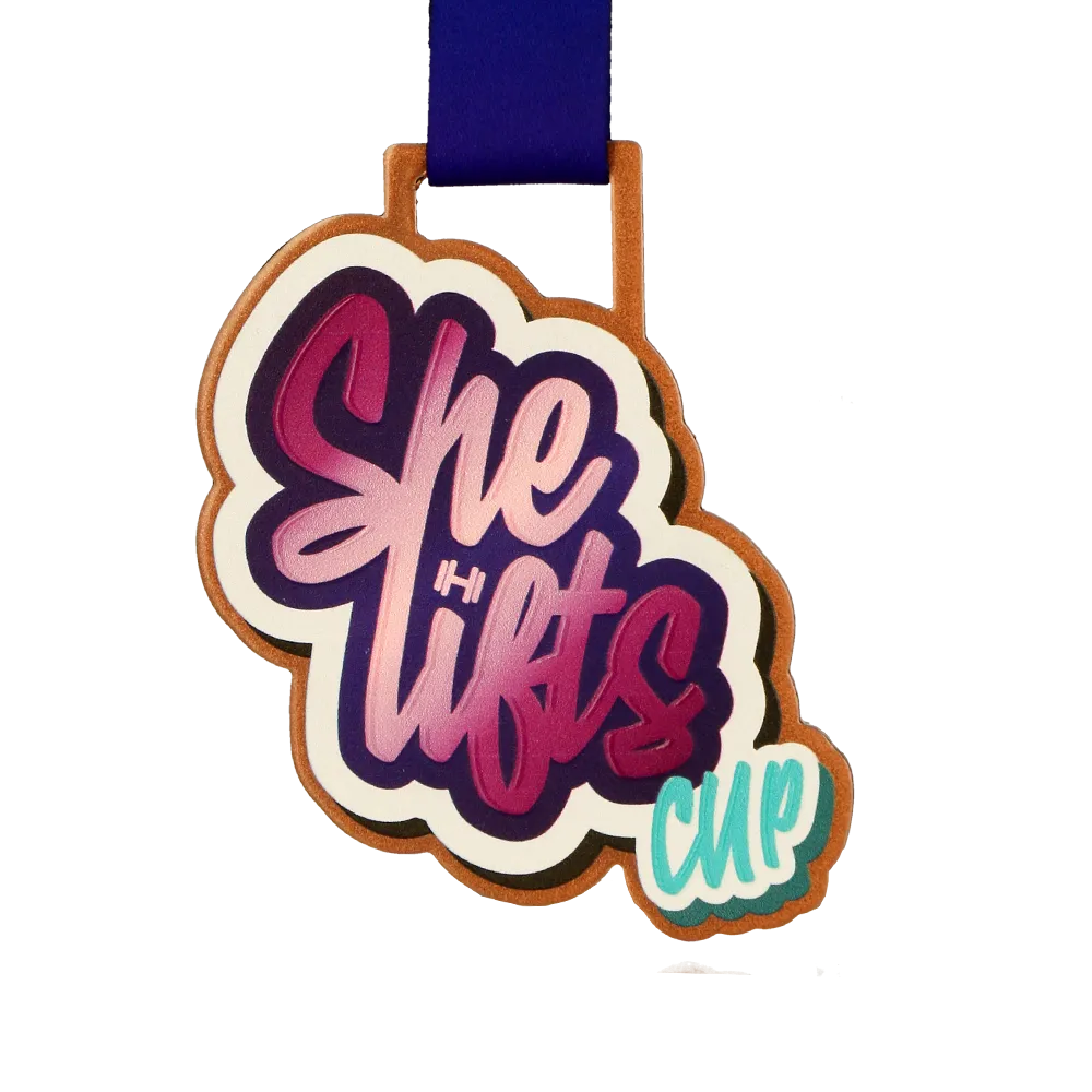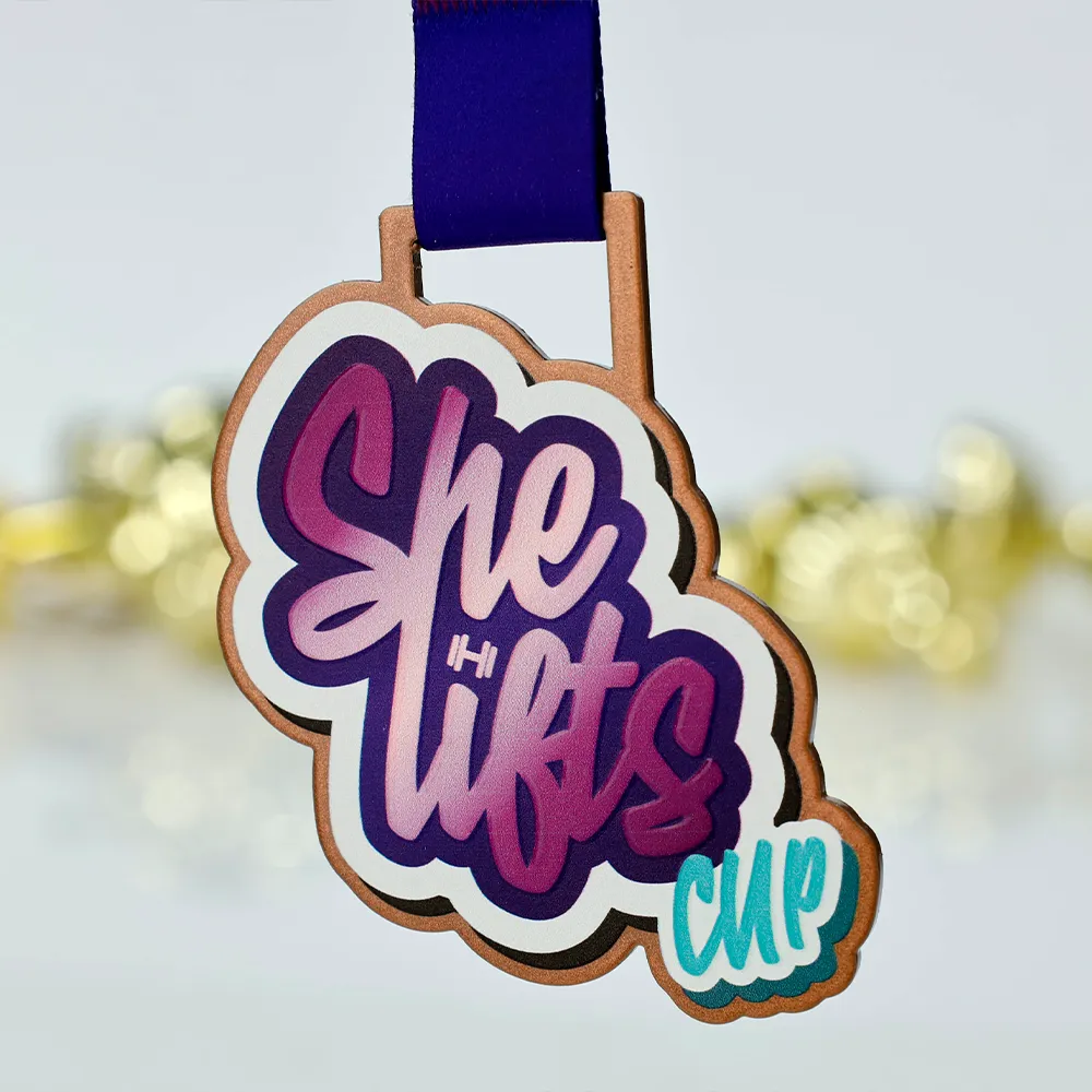 Bespoke medal, created especially for the She Lifts Cup competition. It features an unusual shape and a modern look. The inscription “She Lifts Cup” and a barbell motif are included. The design is printed in shades of purple, pink, and blue using durable UV technology.