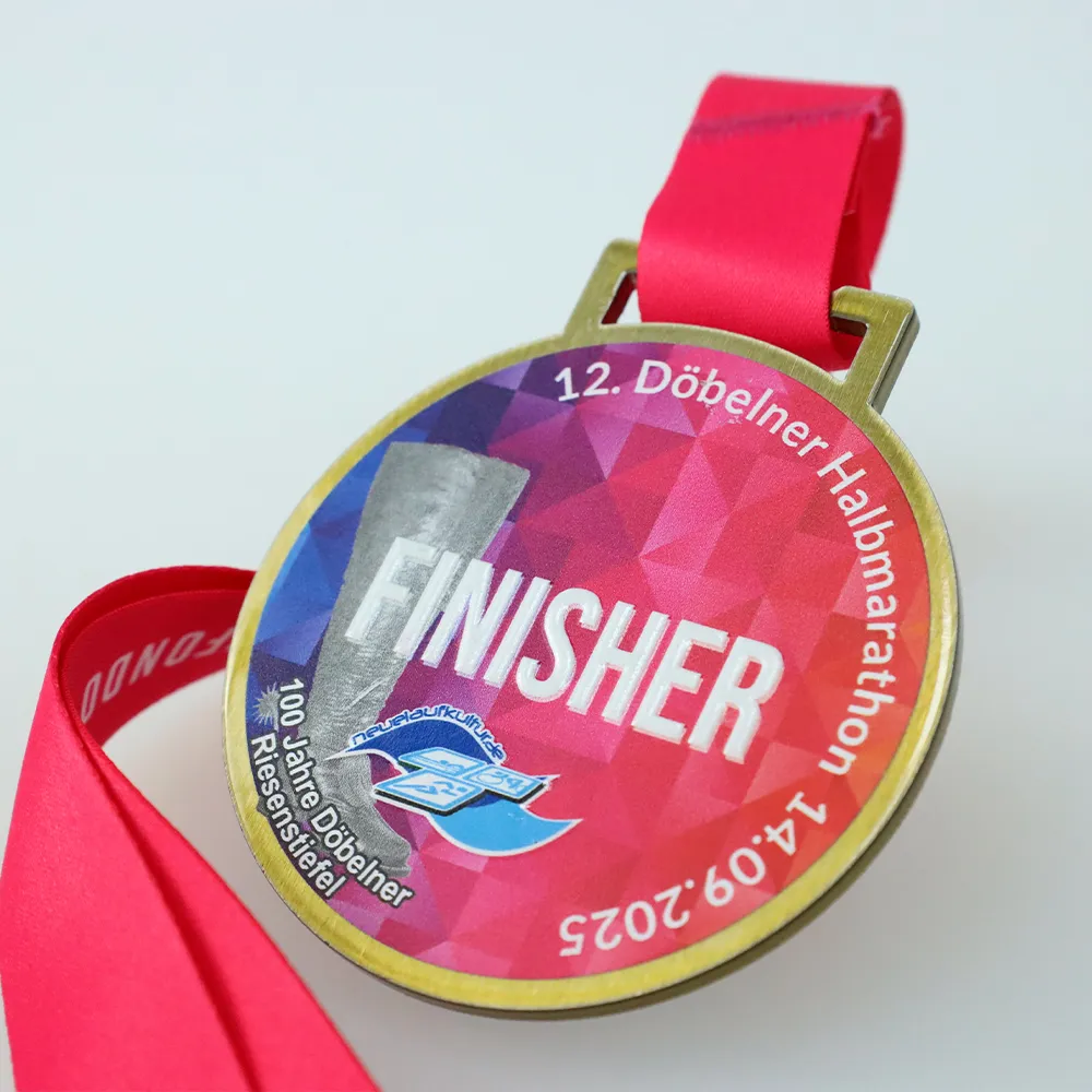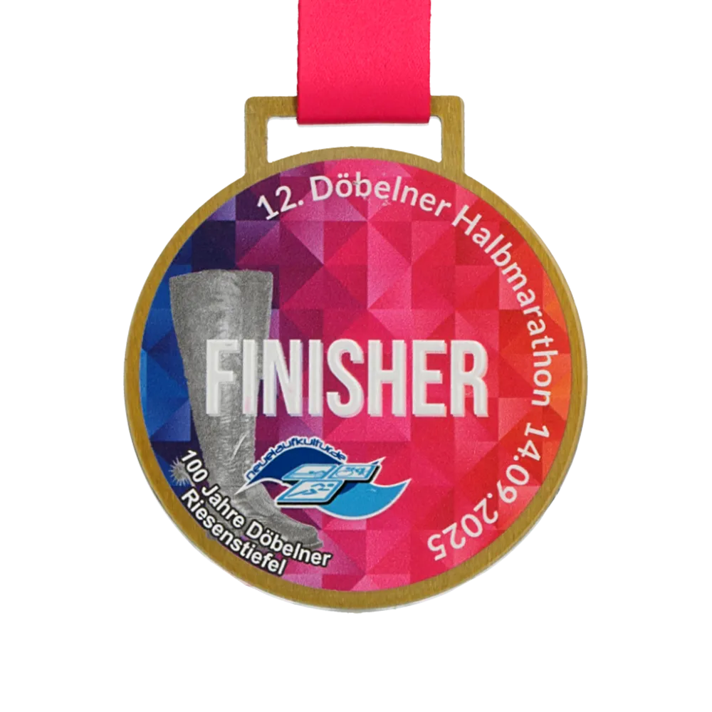 Running medal for Döbelner Halbmarathon 2025 — a steel disc with a brushed gold border and UV printing covering the entire surface with a geometric composition in pinks, purples, and blues. The word FINISHER dominates the centre of the design, while the full race name and date arc around the circumference, creating a complete record of the edition.