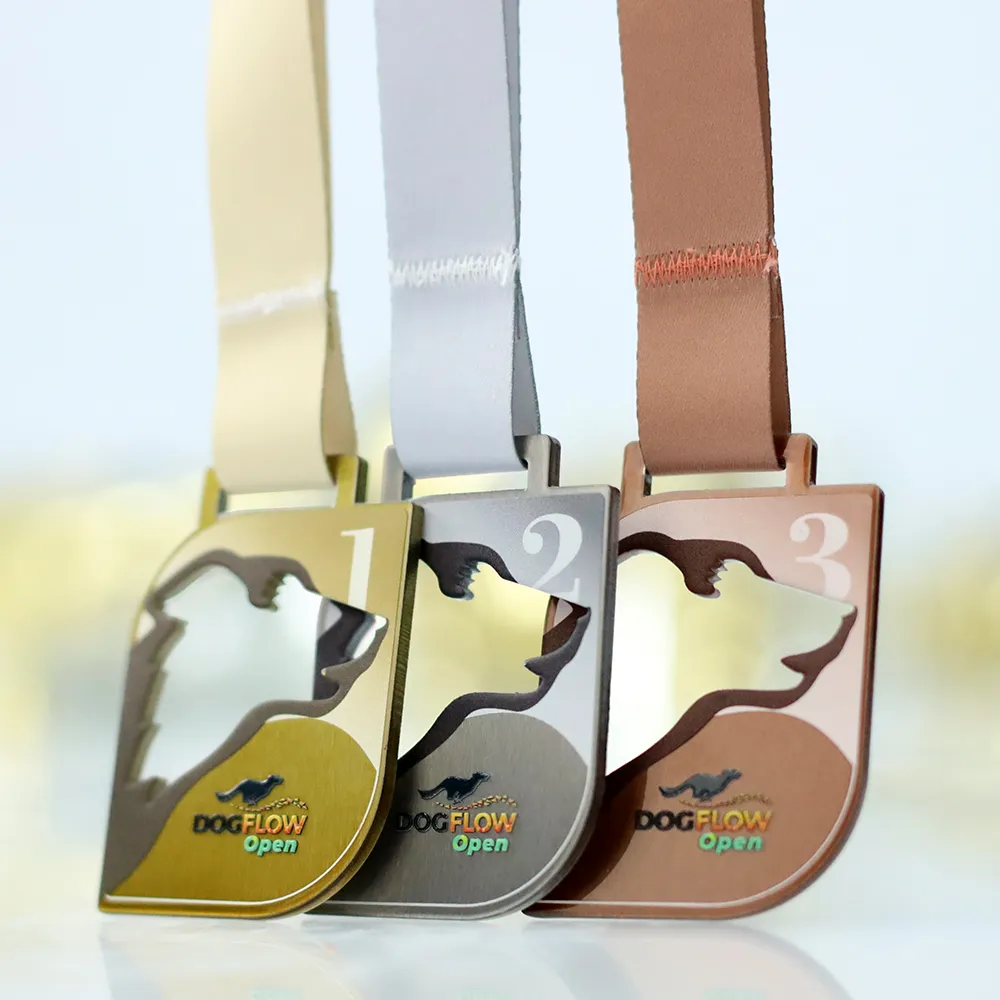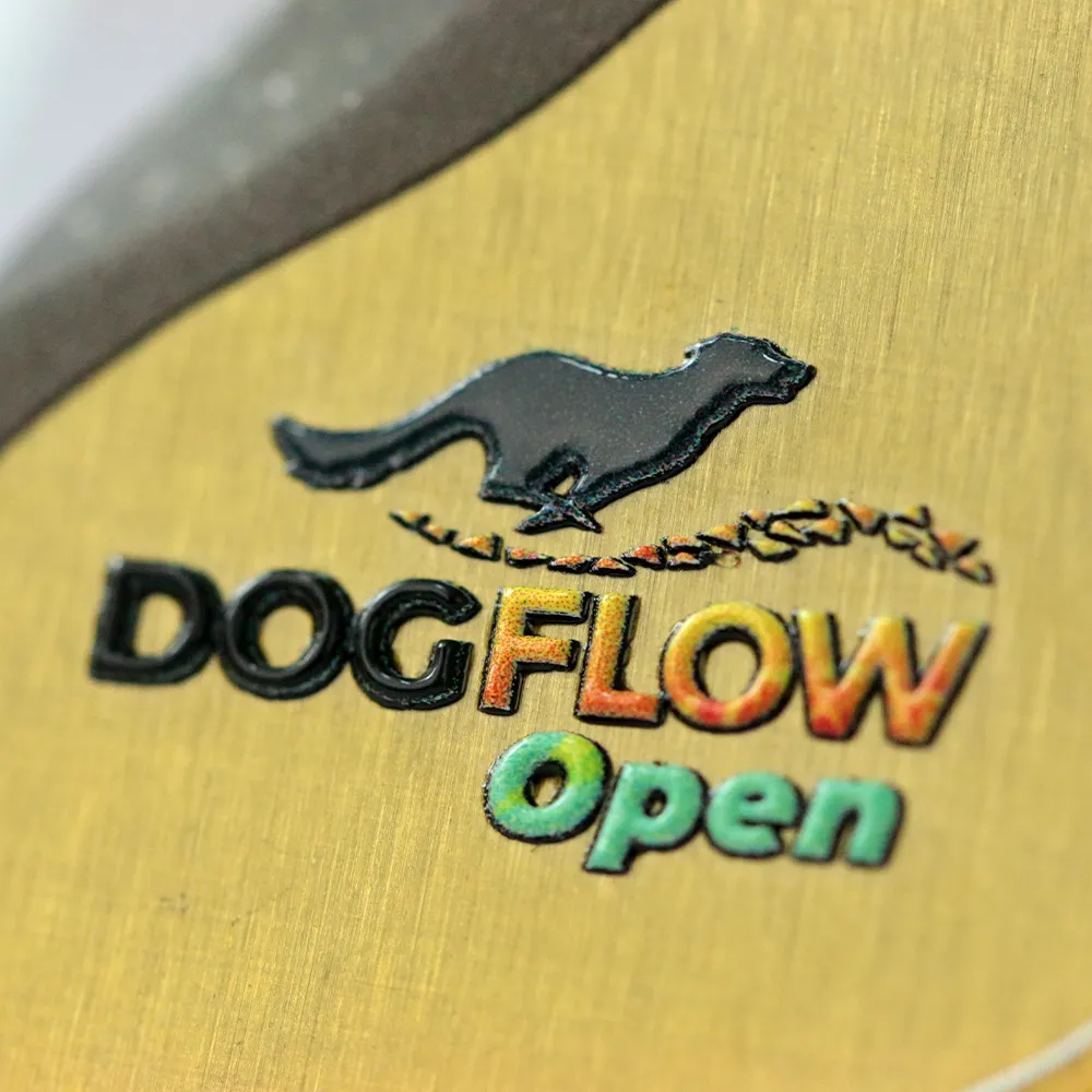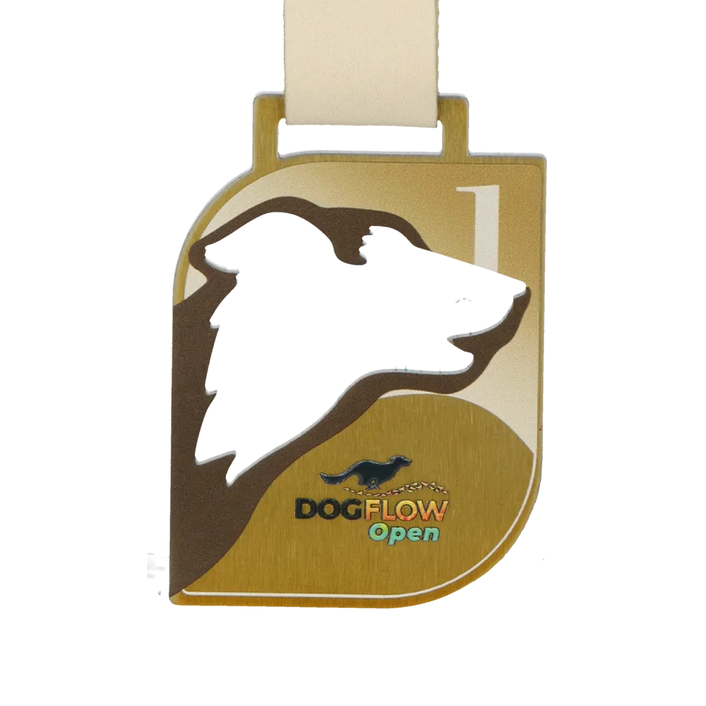 Bespoke medal for DogFlow Aréna 2025 — a laser-cut steel disc with a brushed gold finish, whose outline combines a rectangular frame with an openwork dog's head silhouette cut into the upper half of the surface. UV printing covers the background with a flowing composition in shades of gold and bronze, upon which the tournament logo featuring a running dog and the multicoloured DogFlow Open lettering are set.