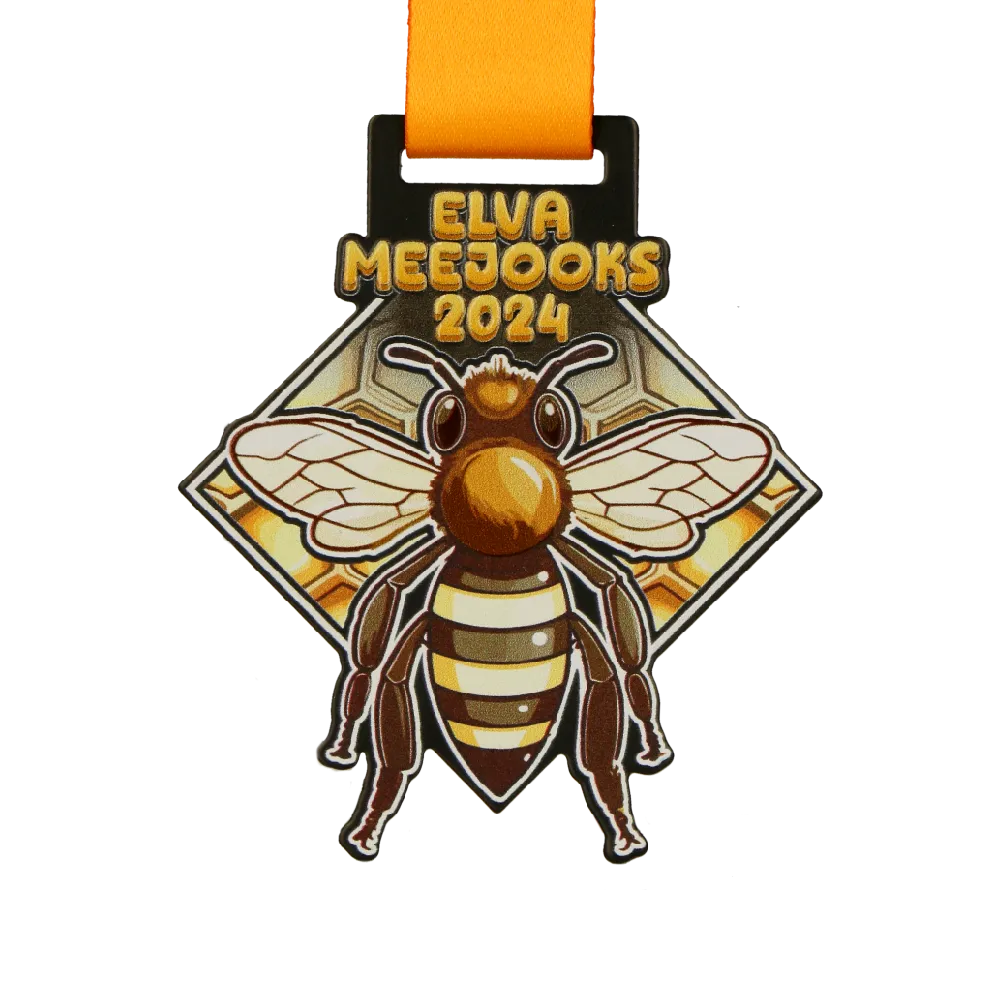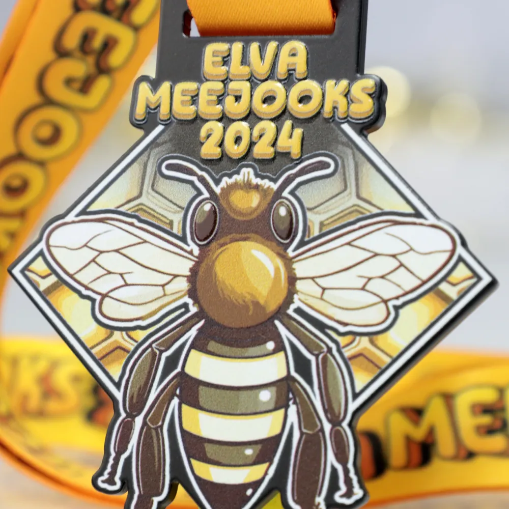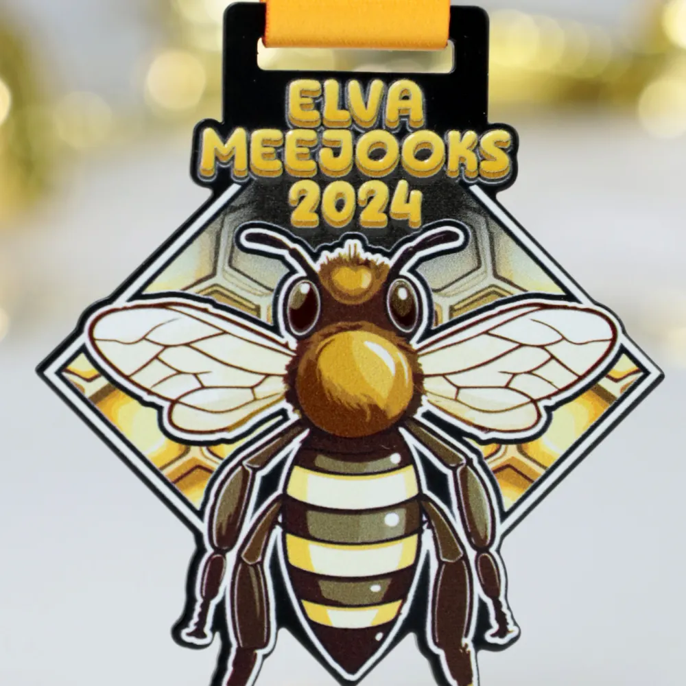 Bespoke medal with a unique shape, designed for Elva Meejooks 2024 – a bee-themed run. The UV print features a detailed graphic of a bee on a honeycomb background, in dominant shades of gold, brown, and black. Personalisation includes the event name and year.