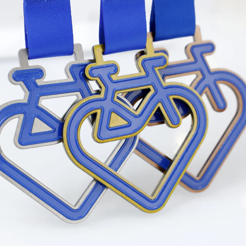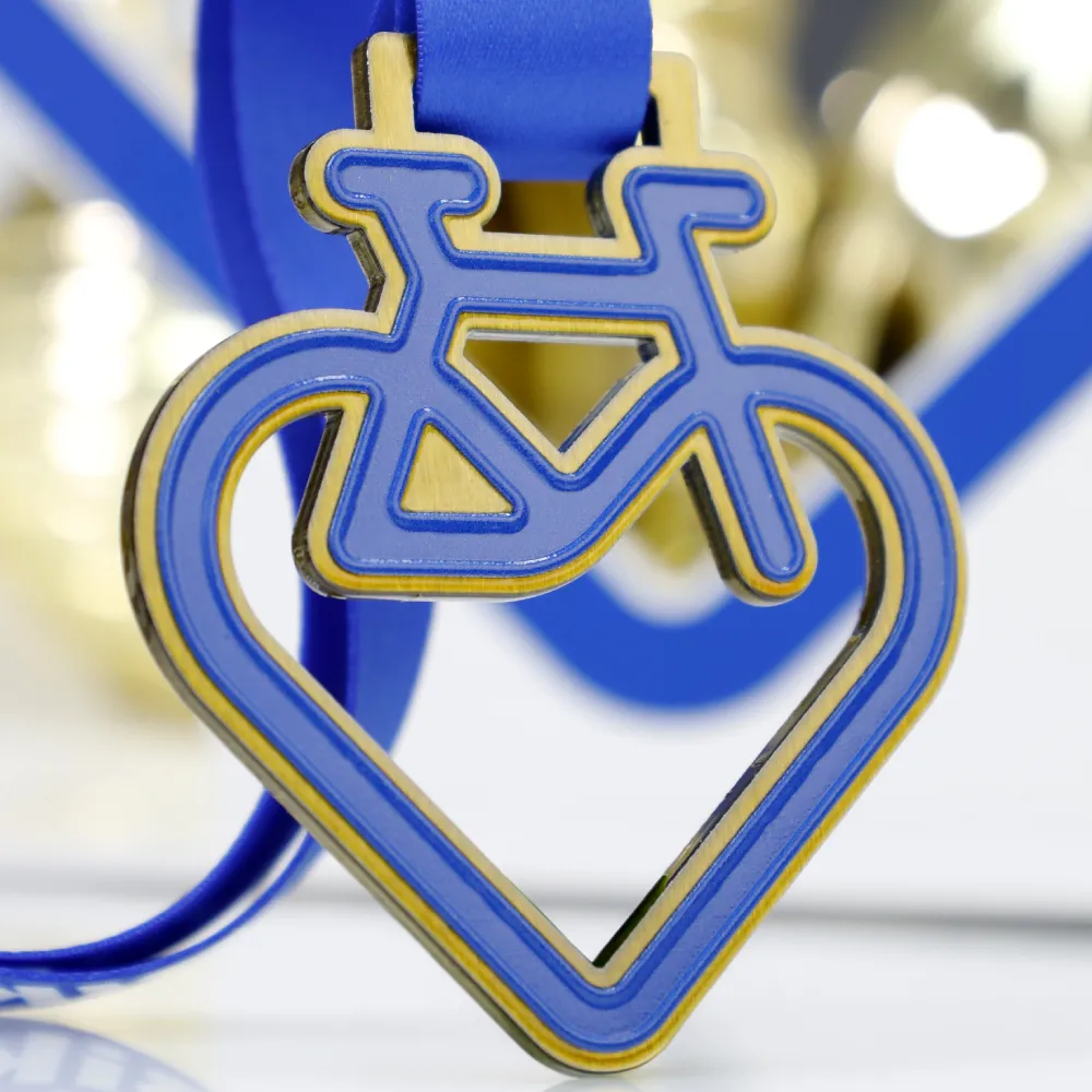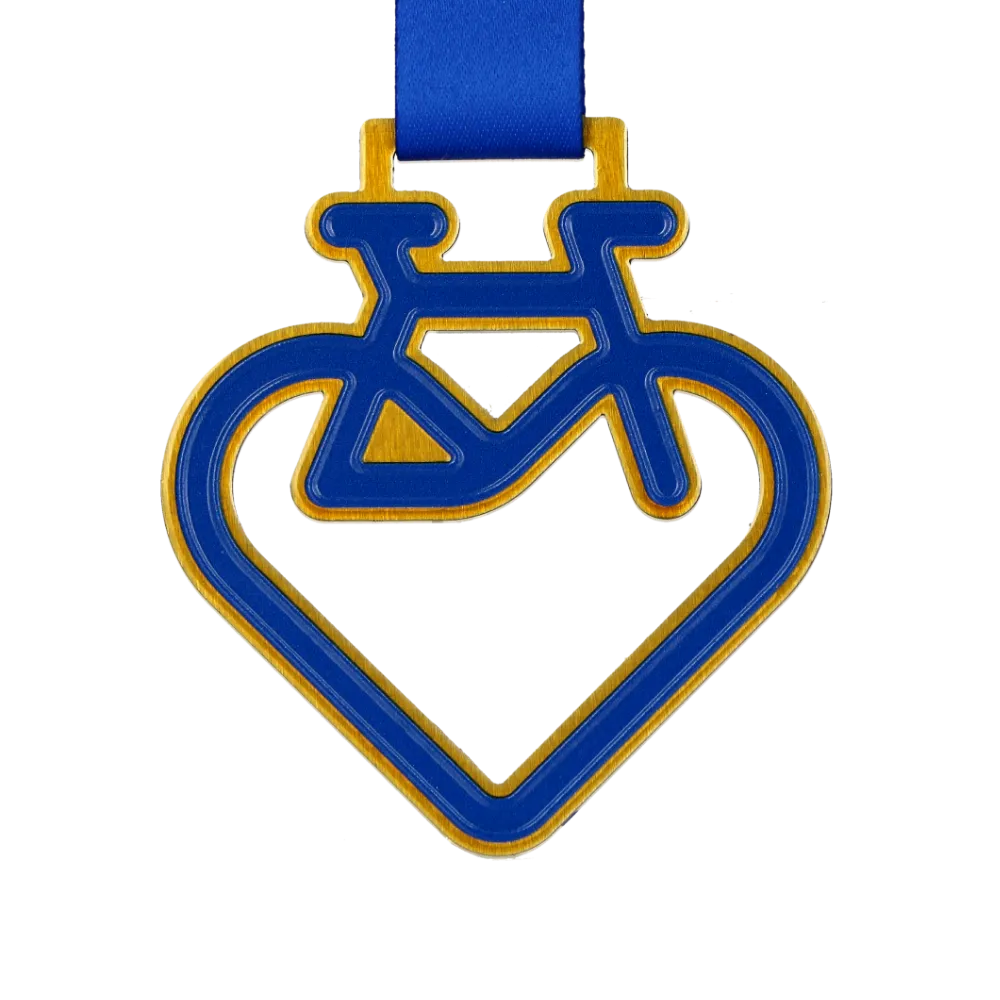 Sport medal specially designed for a cycling event. The original shape combining a heart and a bicycle highlights the passion for cycling. The colours are blue with a golden accent, and the graphic is made using UV print. A matching blue ribbon is included.