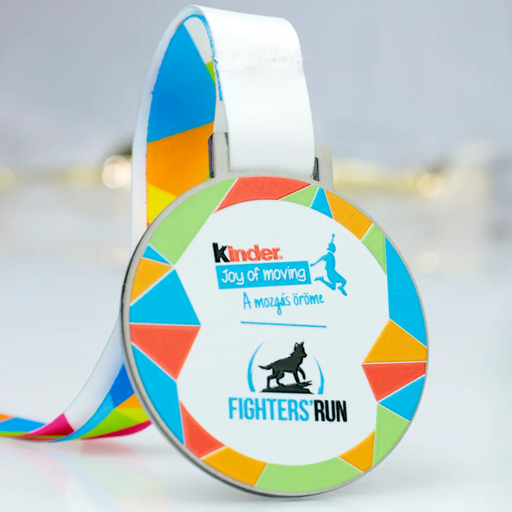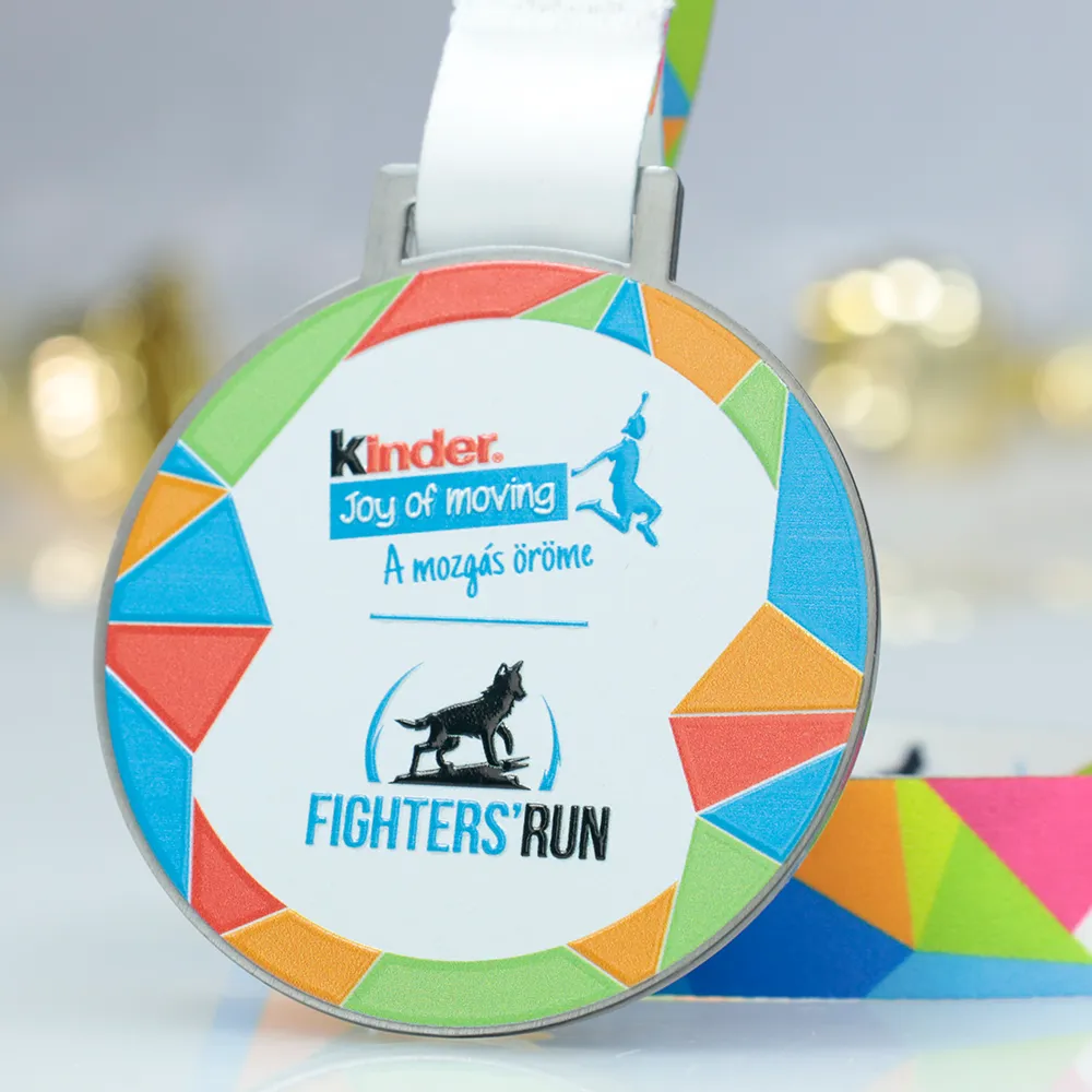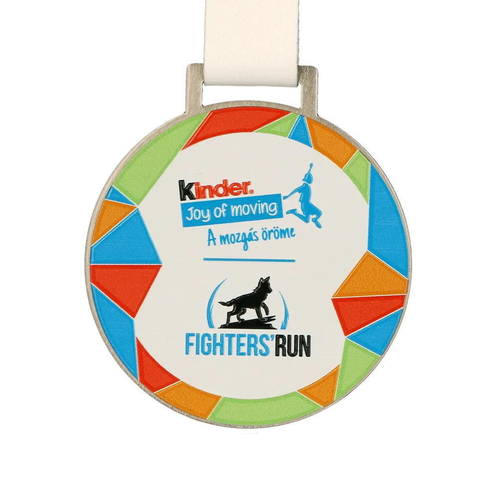 A round personalised running medal created for the Fighters' Run, an initiative by Kinder Joy of Moving. The central design showcases the event logo with an image of a dog and the slogan 'A mozgás öröme'. The edges are decorated with colourful segments in shades of blue, green, orange, and red, adding a dynamic feel. The medal is paired with a white ribbon, completing the design.