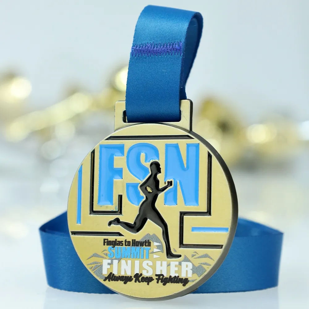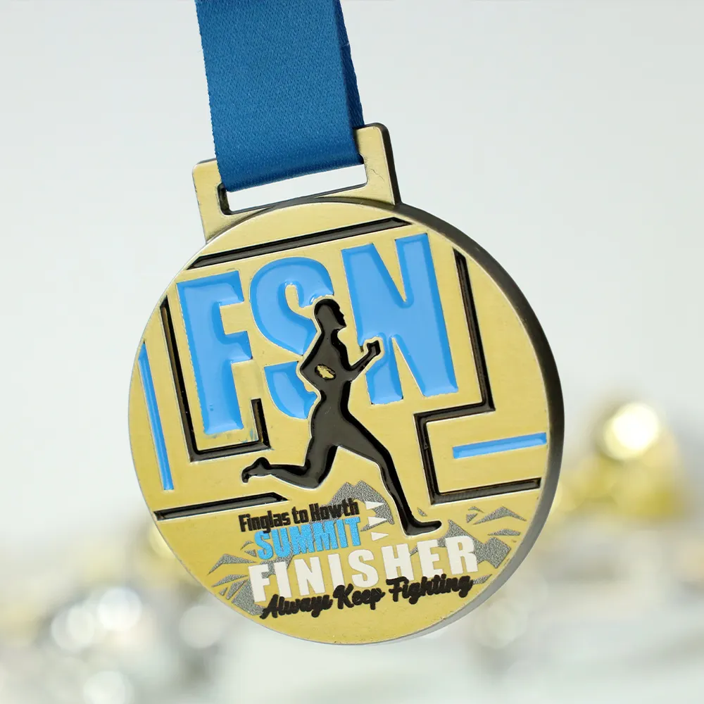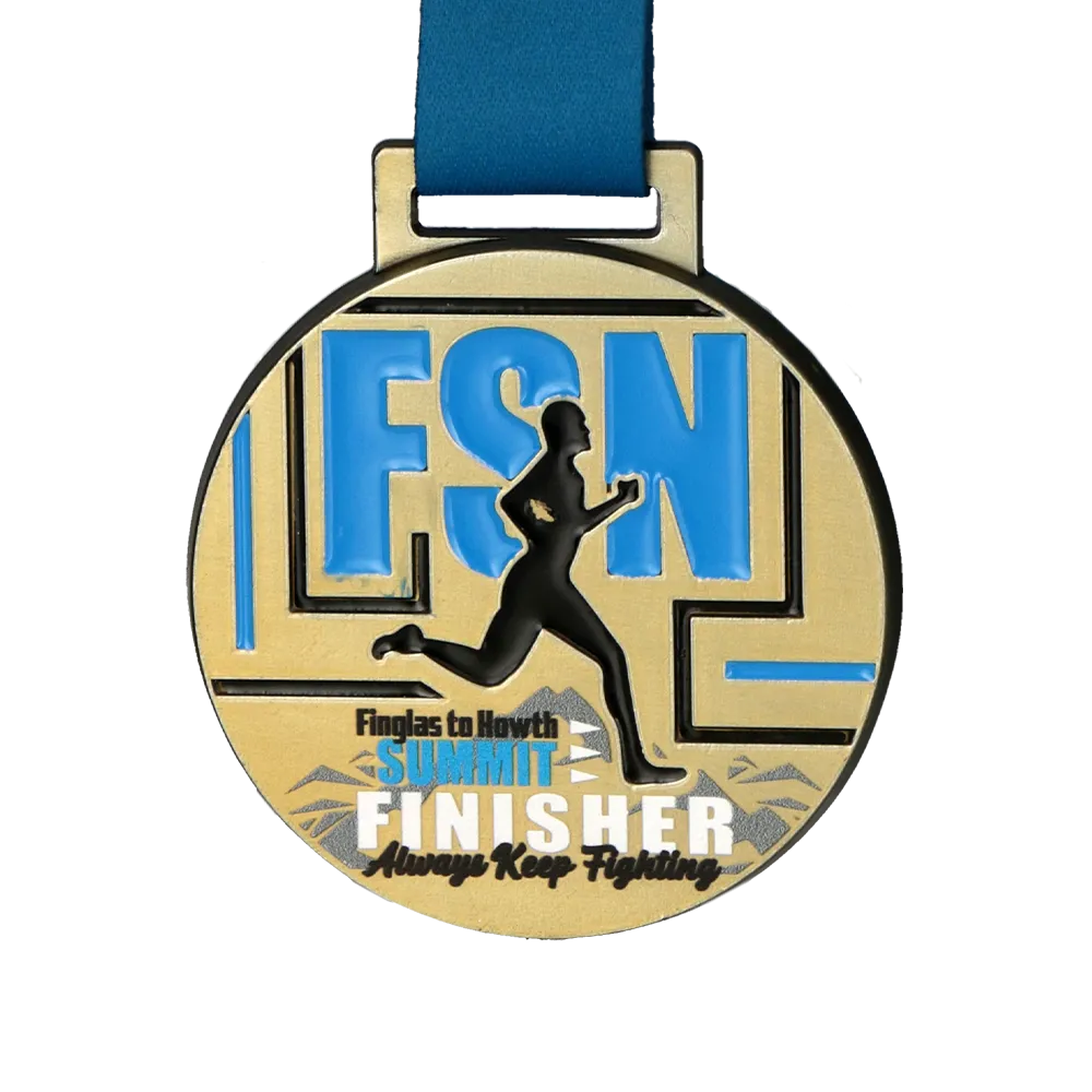 We present a striking cast medal created especially for the Finglas To Howth Summit 2025, combining the classic elegance of gold with modern sports design. A solid Zinc Alloy base provides the background for a dynamic composition where the large FSN letters and the runner's silhouette are highlighted with colourful enamel. The clear "FINISHER" inscription and the mountain peak graphics at the bottom give it a professional character, perfectly matching the rank of the event. It is a bespoke medal that not only rewards effort but also serves as an attractive showcase for the organiser.
