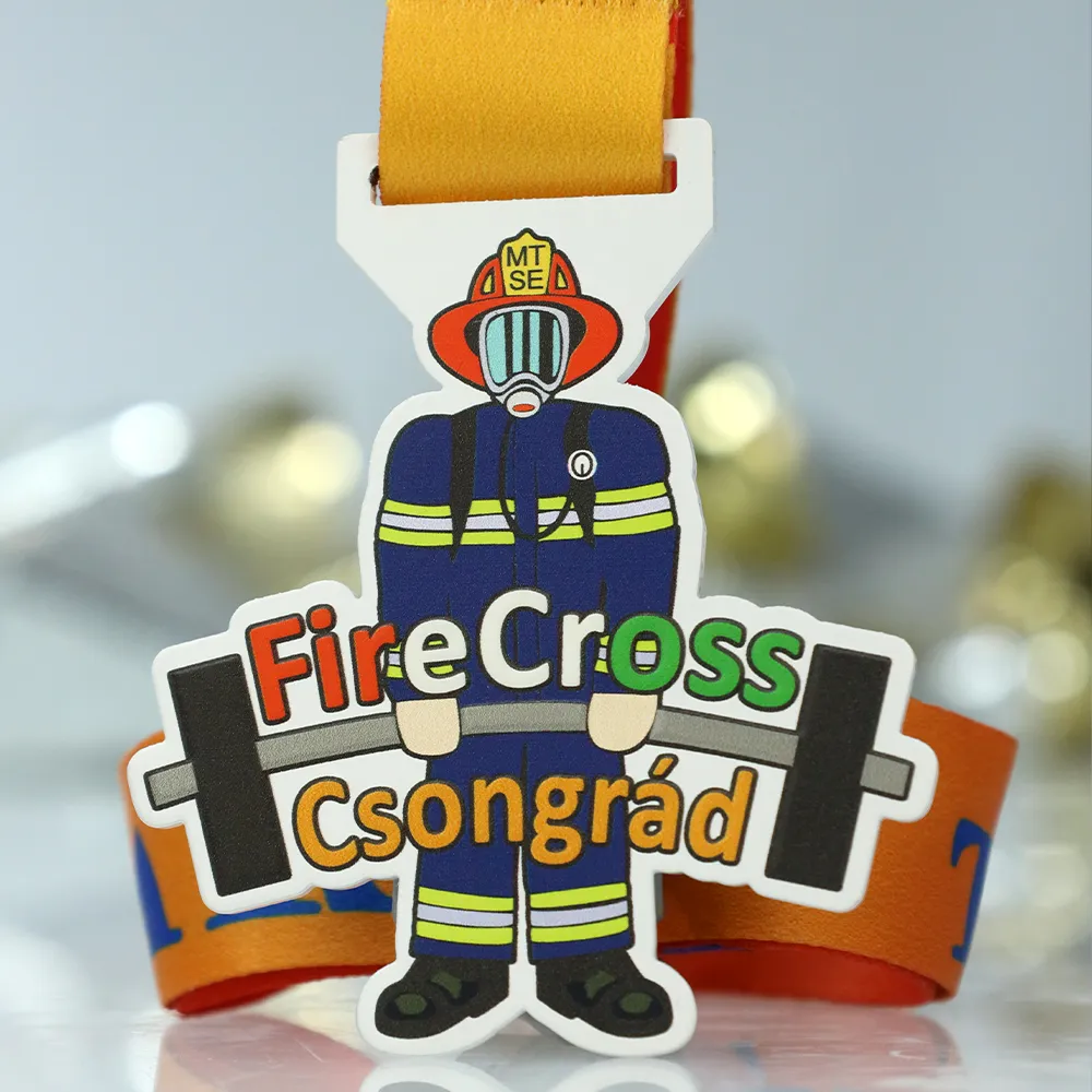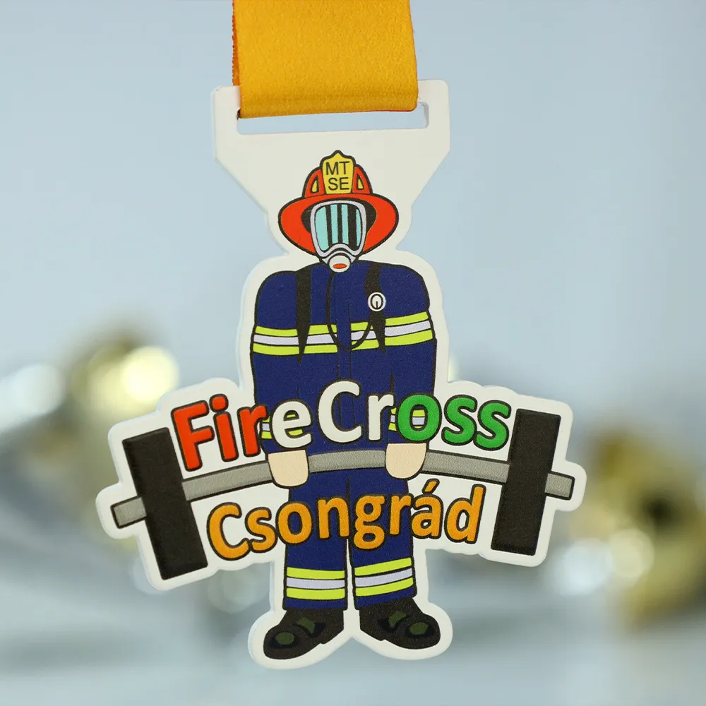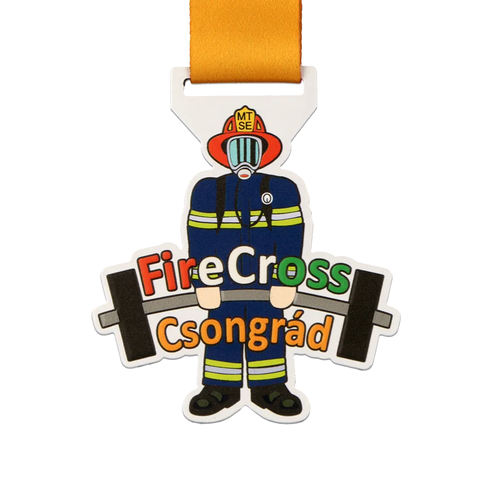 Here is a personalised medal created especially for the FireCross Csongrád 2025 competition, merging CrossFit themes with firefighting motifs. Solid metal has been shaped into a firefighter lifting a barbell, and the vivid colouring achieved through UV printing ensures the medal catches the eye and stands out from classic designs. It is the perfect blend of reward functionality and the organiser's artistic vision.