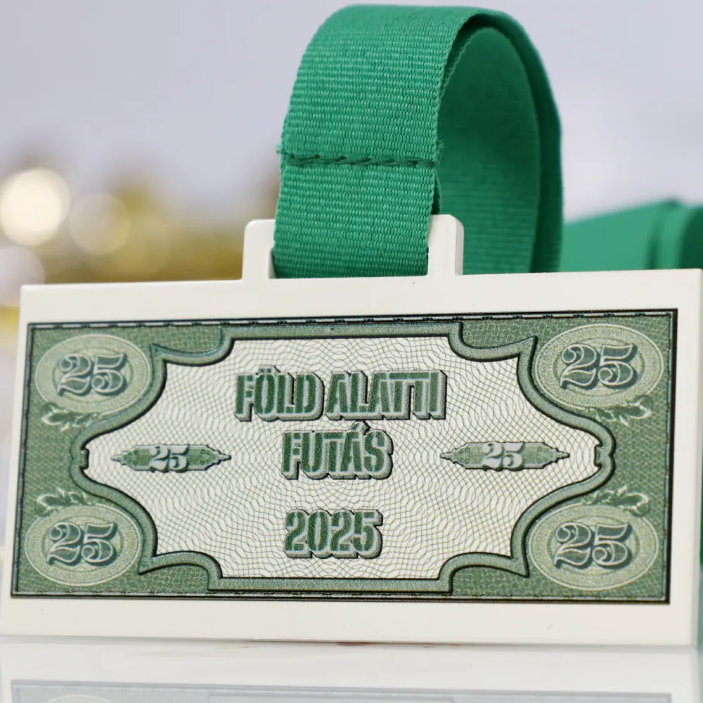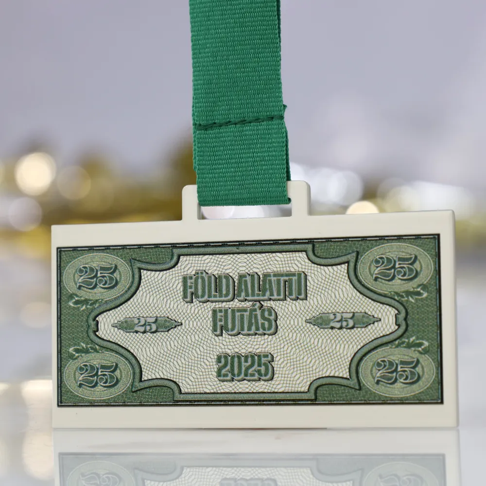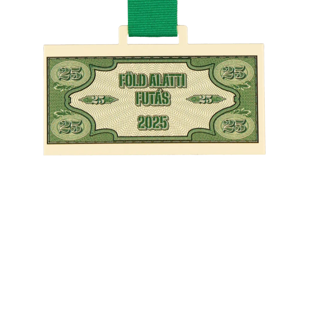 Custom medal design created for Föld Alatti Futás 2025. Styled as a banknote with a dominant green pattern reminiscent of a classic banknote motif. The front displays the event name and year. The bespoke medal is completed with a green ribbon that perfectly matches the colour scheme.