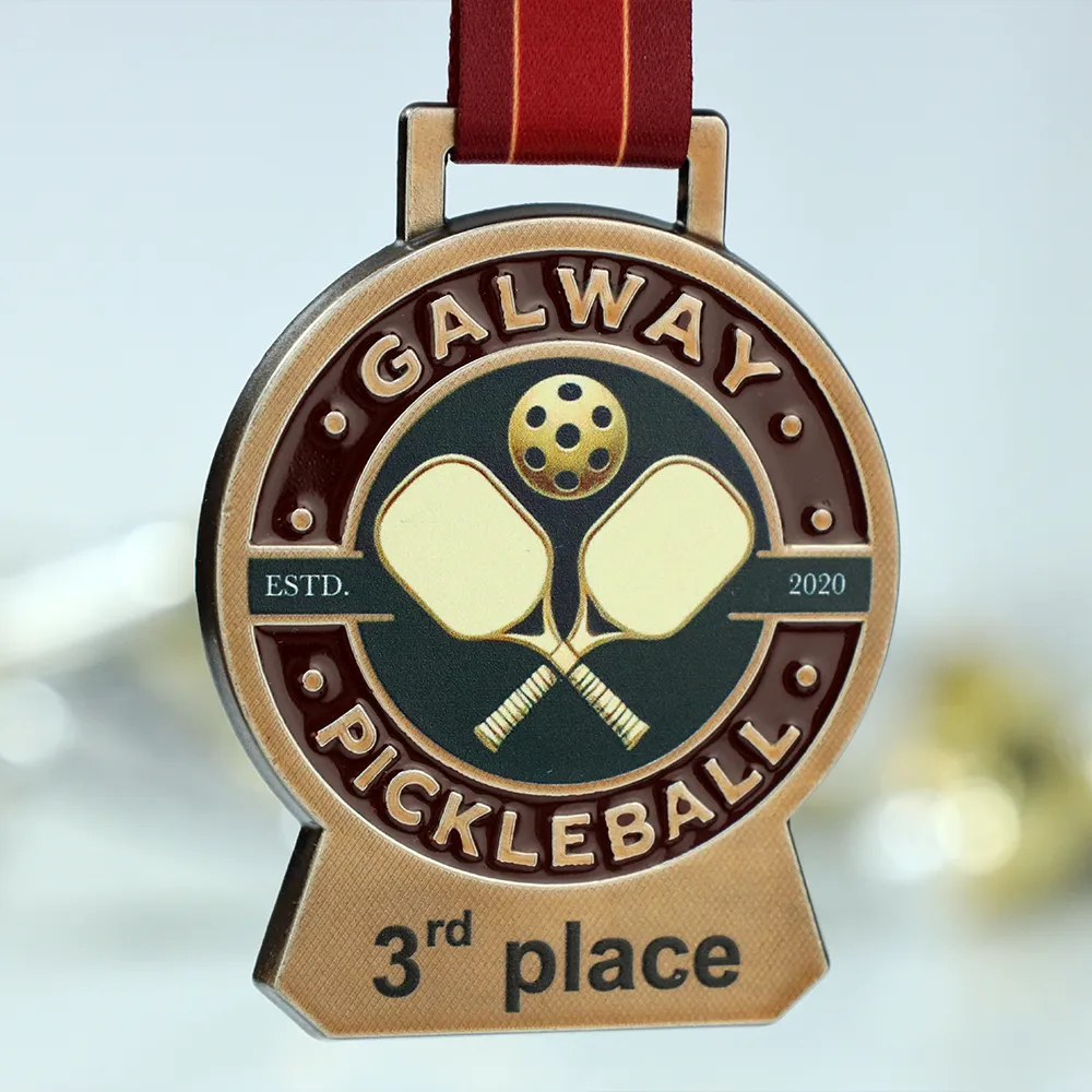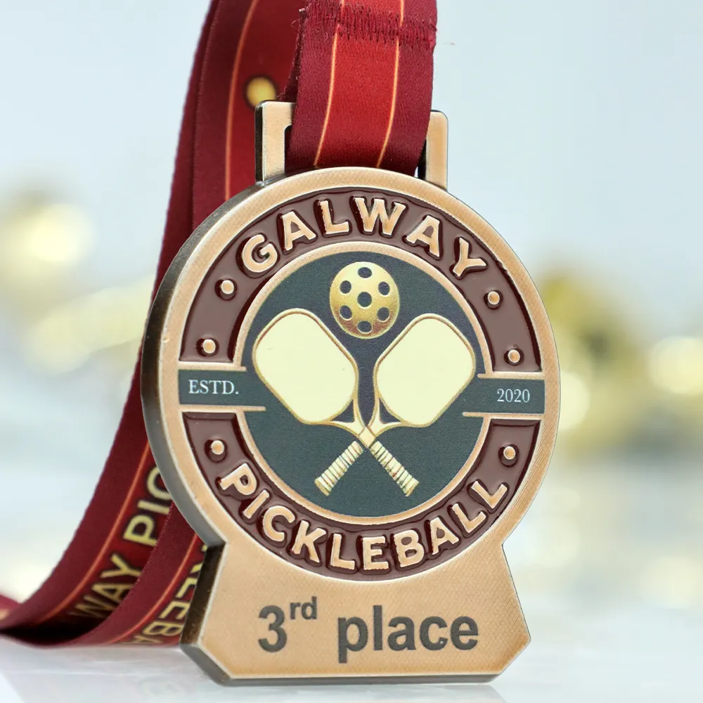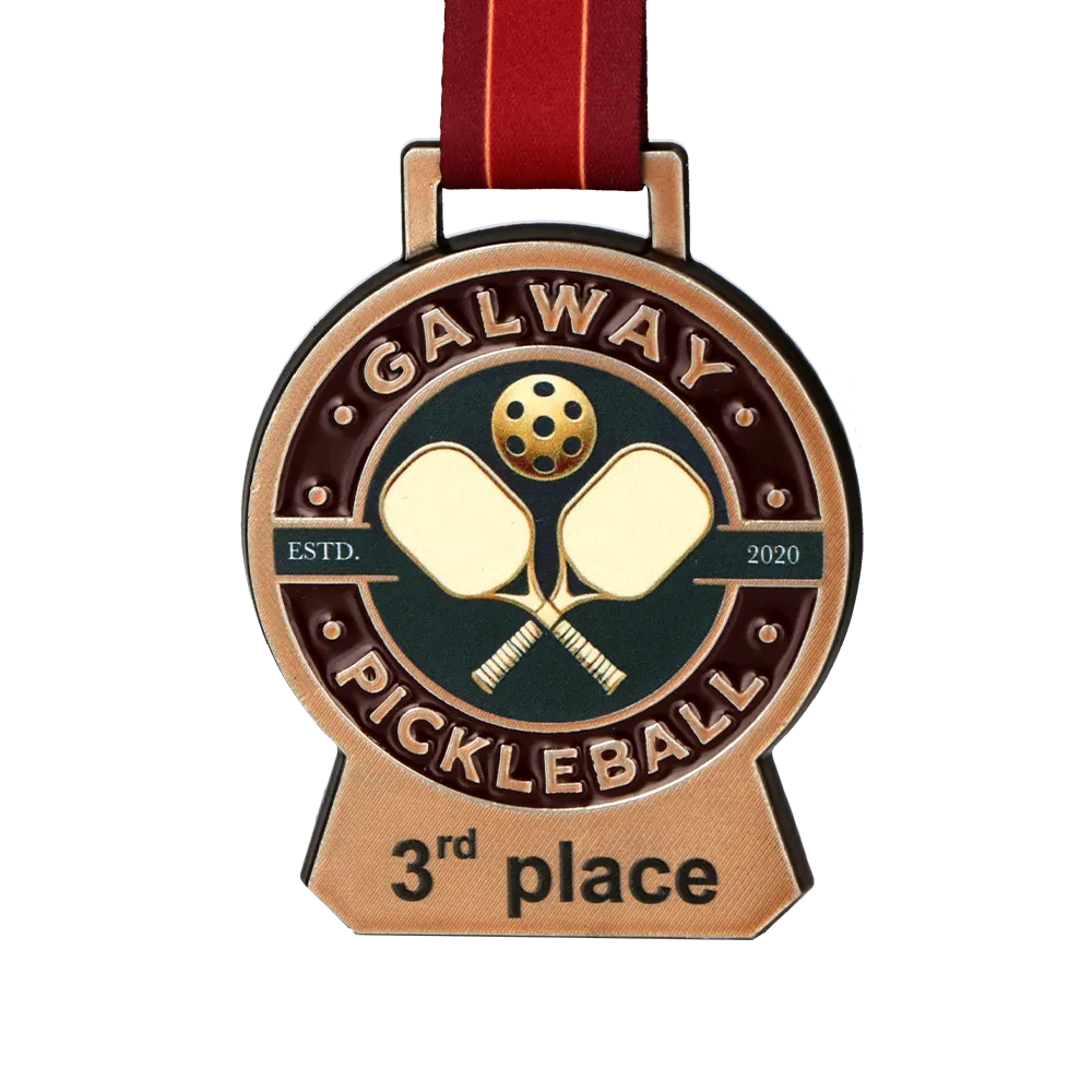 This precise die-cast medal, made from durable Zinc Alloy, is an example of the perfect combination of classic foundry work and modern decoration methods. For the Galway Pickleball Club, we created a design where deep maroon enamel provides an elegant background for raised lettering, while the central motif of crossed paddles and a ball was applied using UV printing. Finished in antique copper, the whole piece creates a solid, technically refined bespoke medal that is resistant to the passage of time.