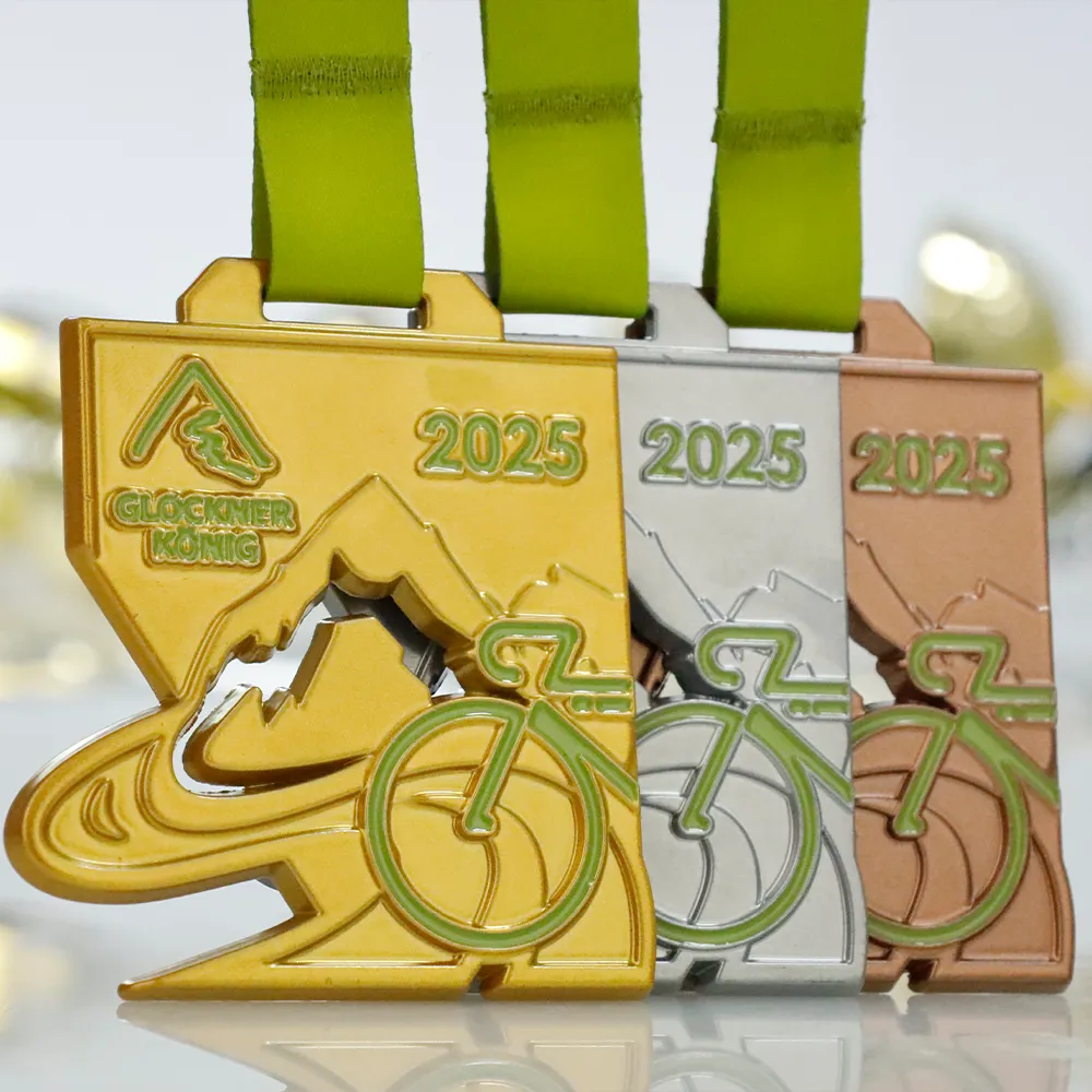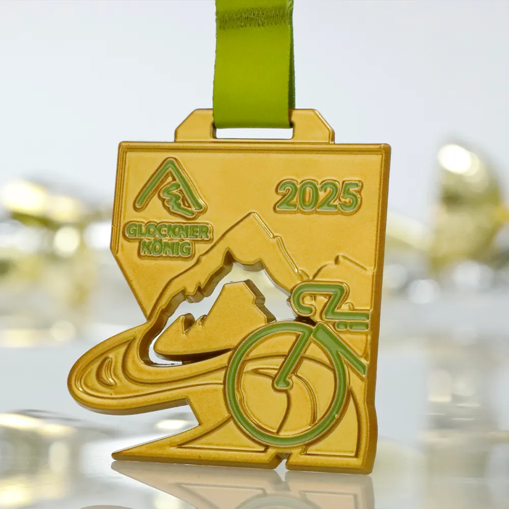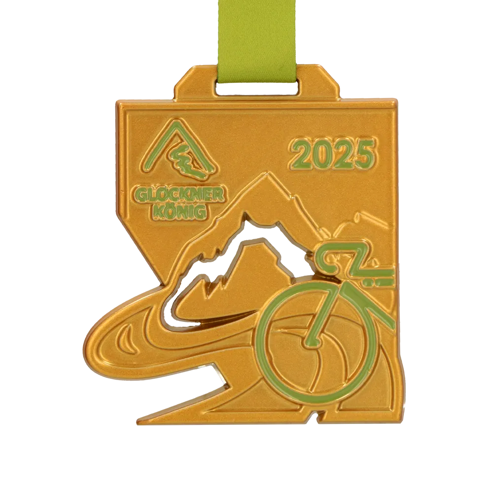 This cast medal was made for the Glocknerkönig 2025 cycle race. It has a custom geometric form and is cast, then powder-coated in Matte Gold. The obverse highlights mountain-race iconography: a mountain silhouette, a flowing river and a bicycle outline in green enamel. Intended for a cycling event, you can see more in our cycling medals.