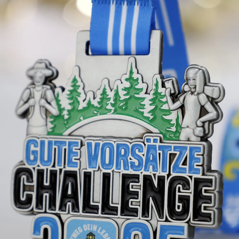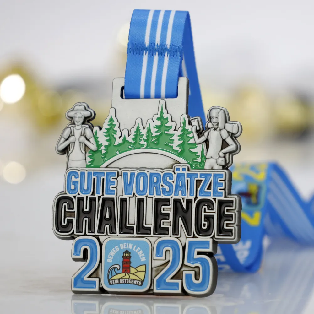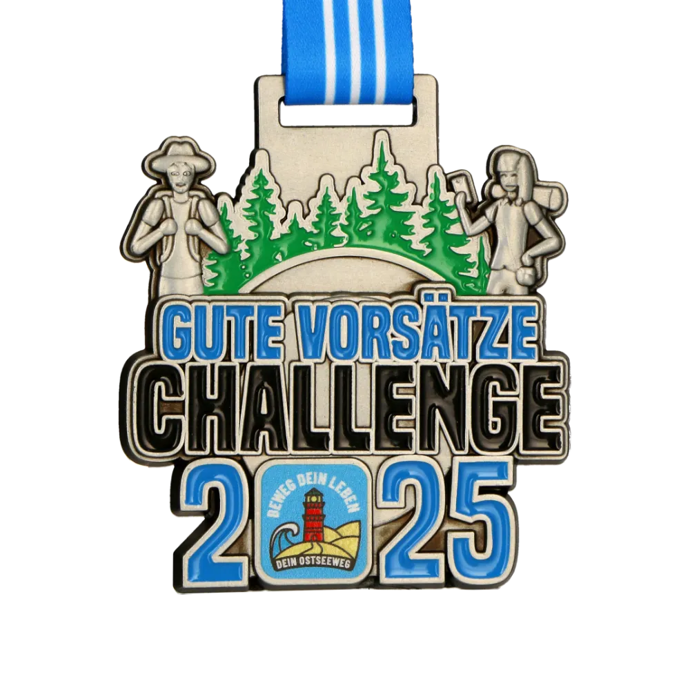 A cast running medal designed for the “Gute Vorsätze Challenge 2025” catches the eye with its silver surface and a distinct green forest motif. Personalised elements, including the event inscription and a lighthouse emblem, emphasise the unique character of the run. A blue striped ribbon ensures comfortable suspension and completes the cohesive aesthetic.