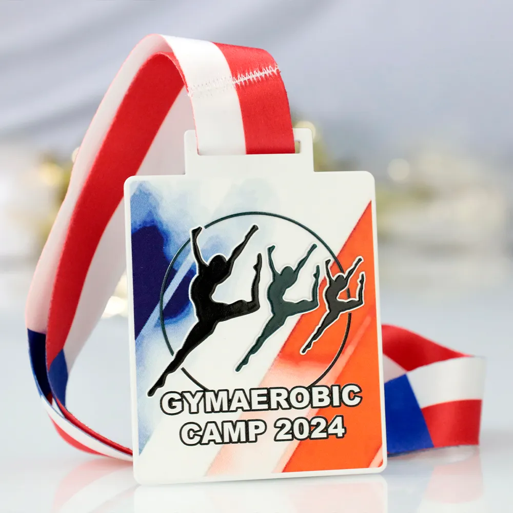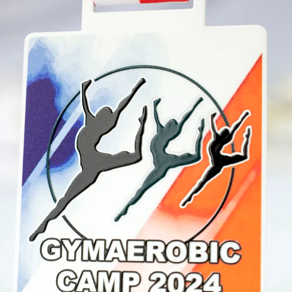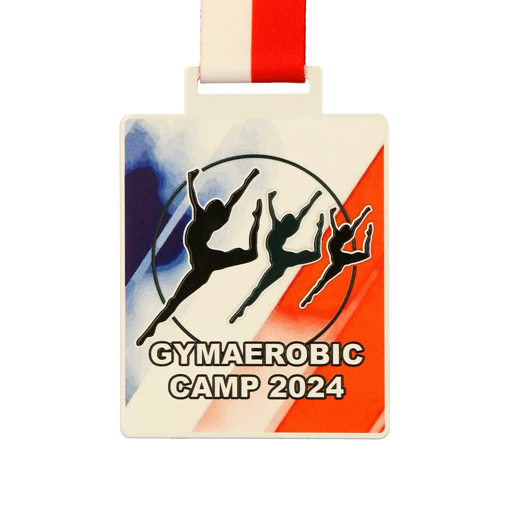 A rectangular sports medal in metal, created for the 'Gymaerobic Camp 2024' event. The dominant colours—white, blue, and red—form a dynamic background with silhouettes of gymnasts performing artistic jumps. The event name and year take centre stage, highlighting the prestige of the competition. The medal is hung on a red-and-white ribbon, perfectly matching the design’s colour scheme.