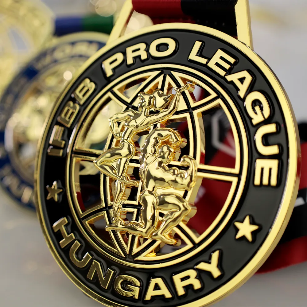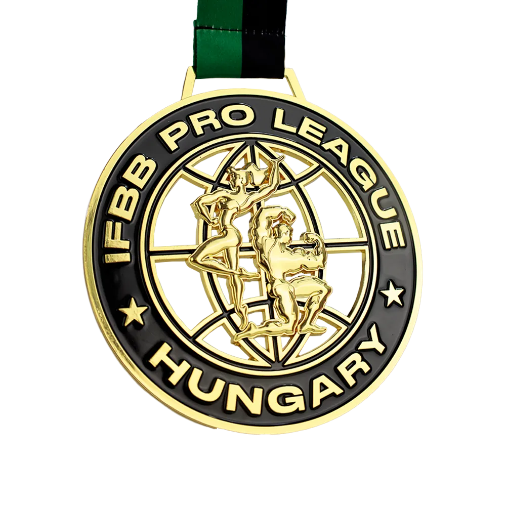 Bespoke Medal created specifically for the IFBB Pro League Hungary. The medal features silhouettes of athletes against a globe, emphasising the international nature of the event. It is a cast medal, and the colourful decorations, such as the golden figures and black elements, were carefully filled with paint, giving it a distinctive style.