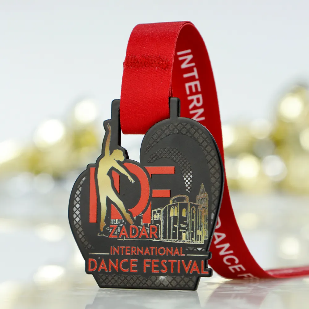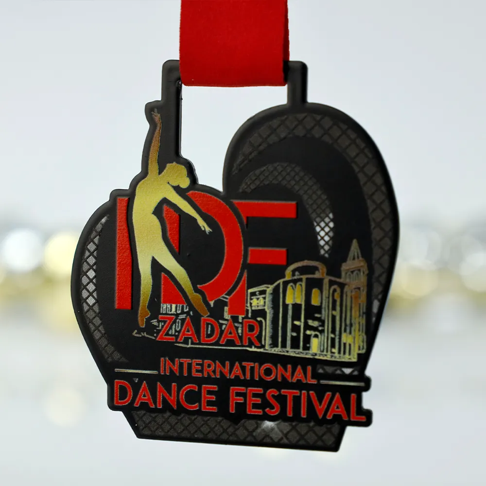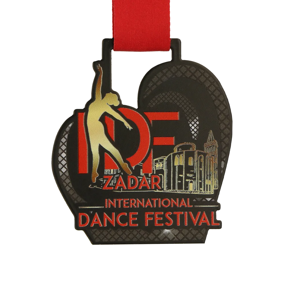 Bespoke medals created for the International Dance Festival in Zadar. The medal features a dancer's silhouette against the backdrop of the IDF initials, the city's name, and Zadar's distinctive buildings. All decorations were applied using UV printing.