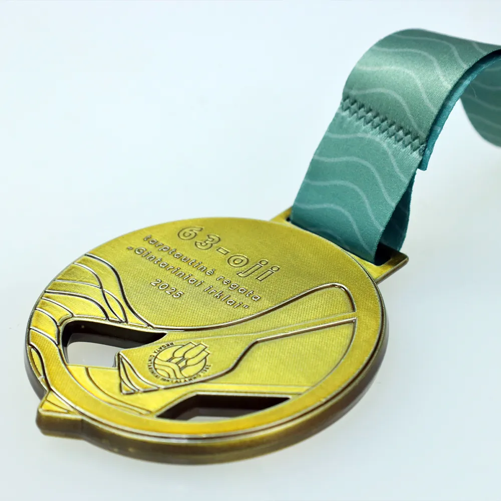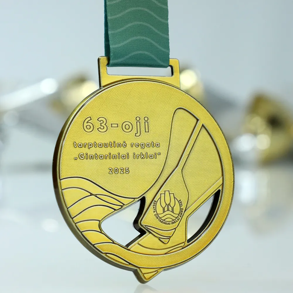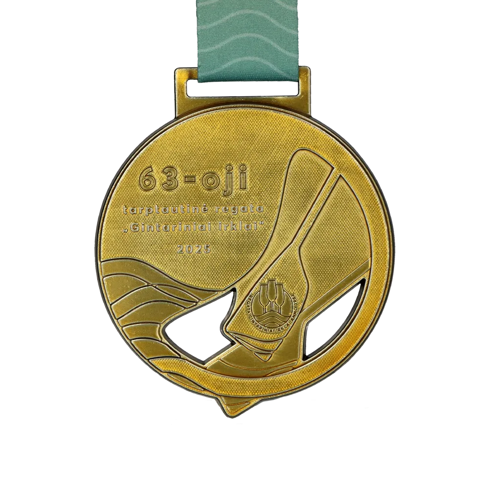 We prepared a special custom medal for the International Regatta Amber Oars. The round medal is made using a casting technique, which allows for complex, raised details. The design shows a stylised silhouette of a rowing boat on waves, with the edition number "63-oji" and the year 2025 placed in the background. This type of medal is a perfect souvenir for rowing fans.