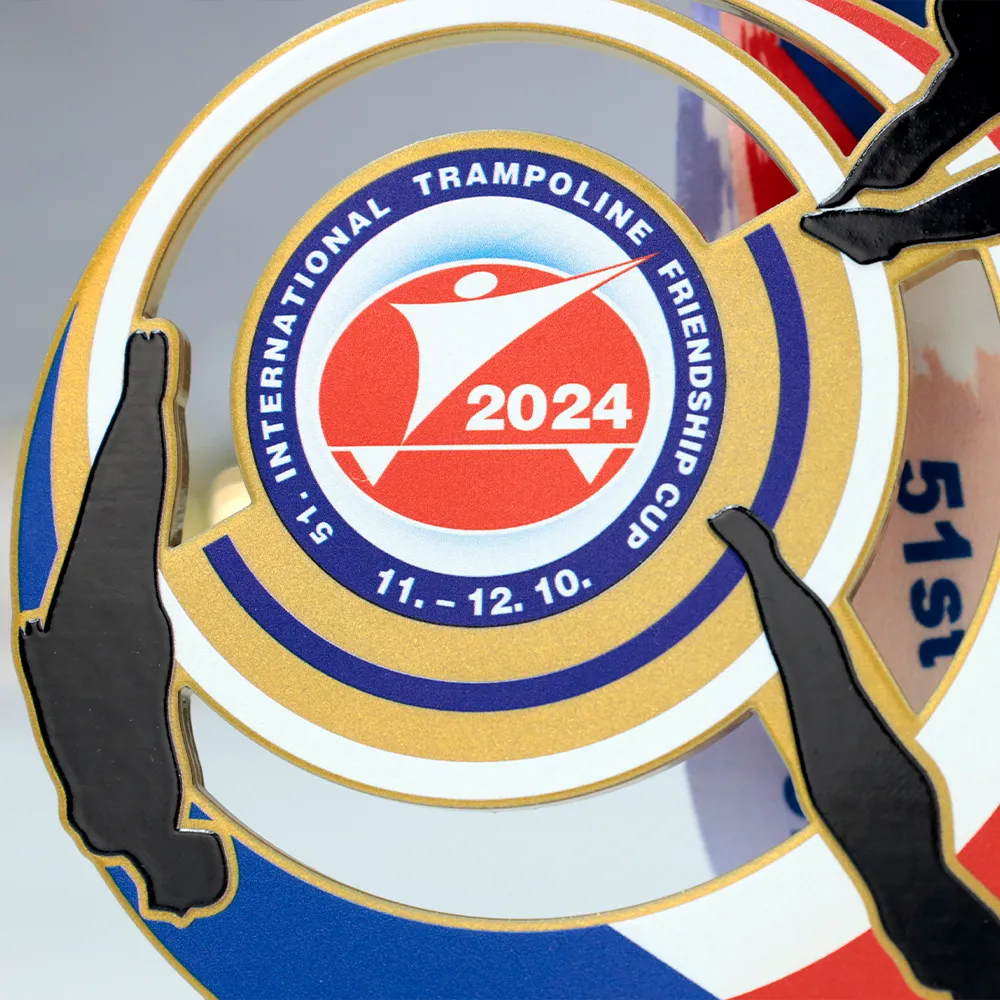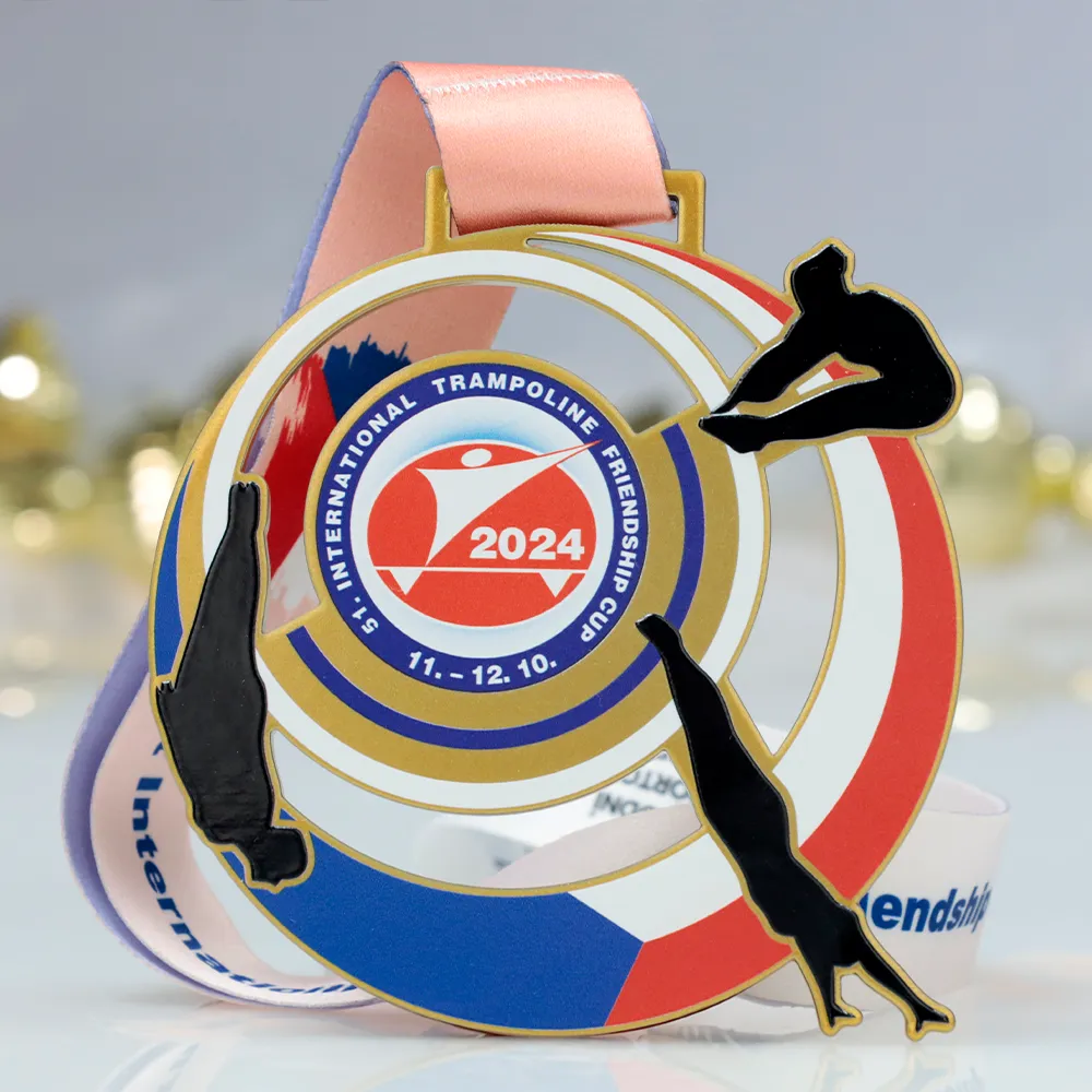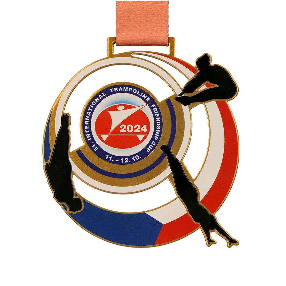 A bespoke sports medal crafted in metal, designed for the 51st International Trampoline Friendship Cup 2024. The design features dominant colours of gold, white, red, and blue, representing the international spirit of the event. The central part of the medal includes the logo and competition dates, surrounded by dynamic silhouettes of gymnasts mid-jump. It is suspended on an elegant orange ribbon.