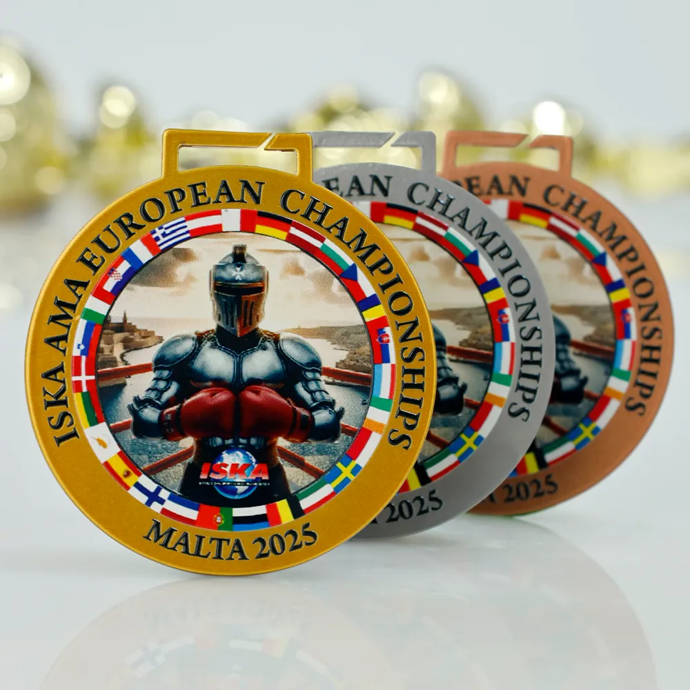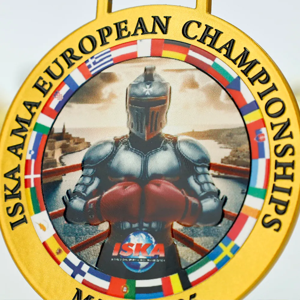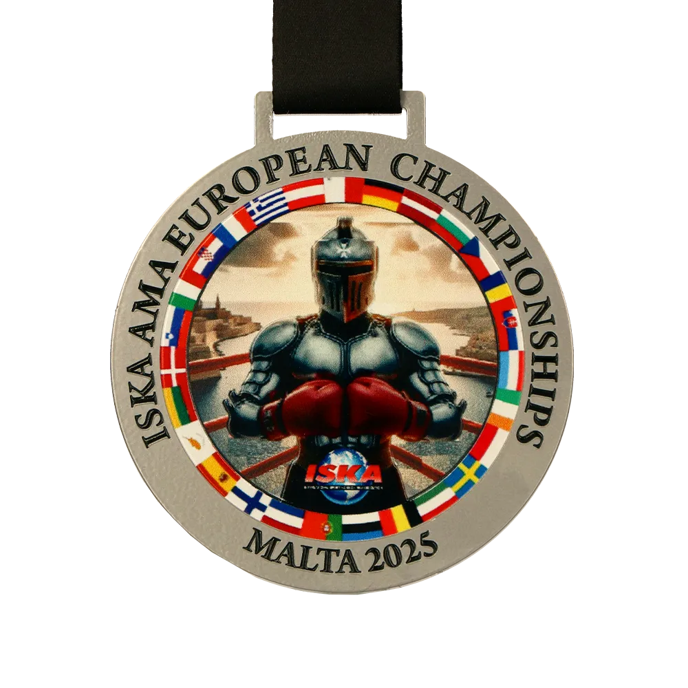 Bespoke medal made for the ISKA AMA European Championships Malta 2025. The front shows a knight in armour with red boxing gloves, surrounded by colourful European flags. UV printing ensures vivid colours and high durability of the design. Personalisation includes the event name, location, and year. The medal comes with a black ribbon.