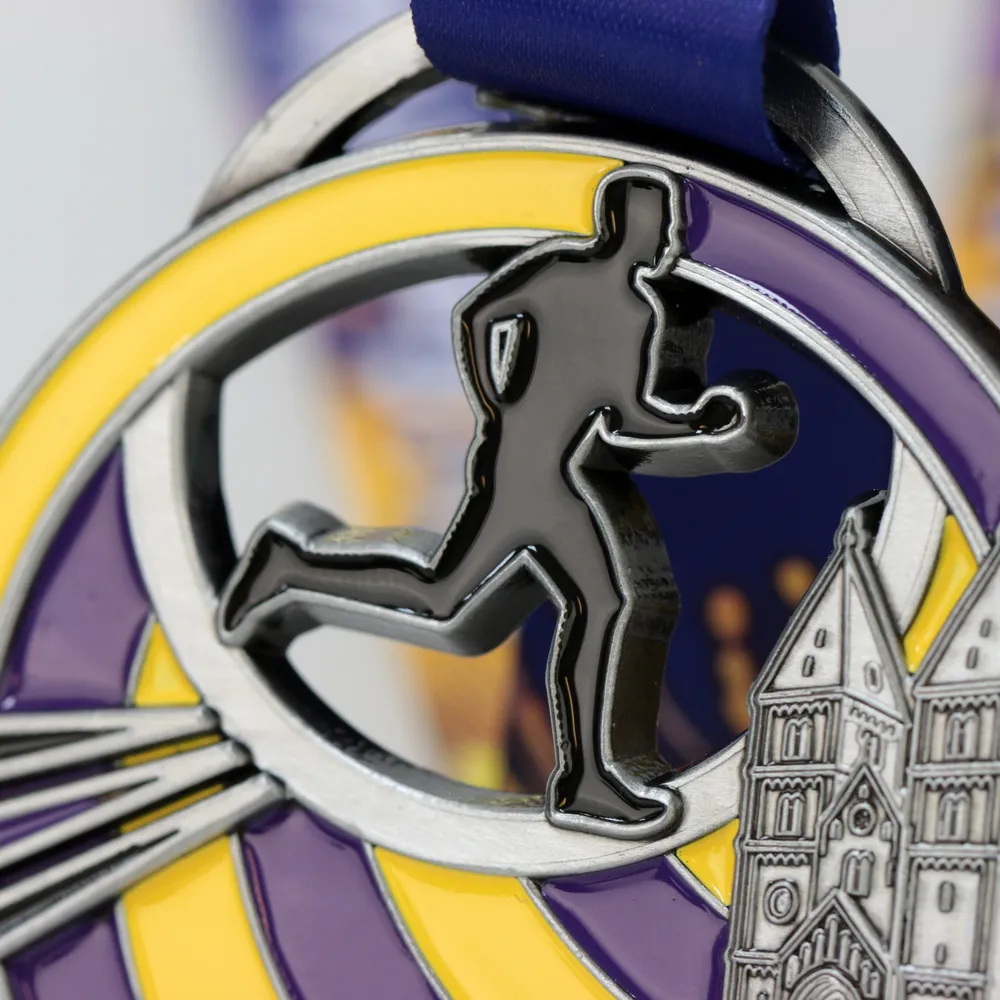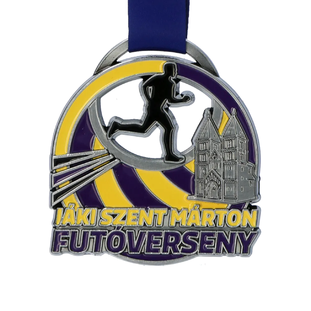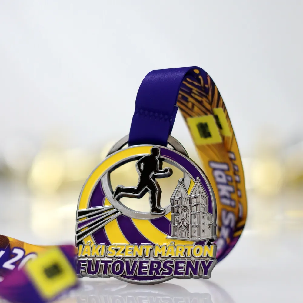 The bespoke medal for Jáki Szent Márton Futás is a masterclass in die-casting. The runner’s silhouette and the church architecture on the right are rendered with exceptional clarity. Bold purple and yellow enamel fills the background, creating a striking, high-contrast look against the polished silver metal.