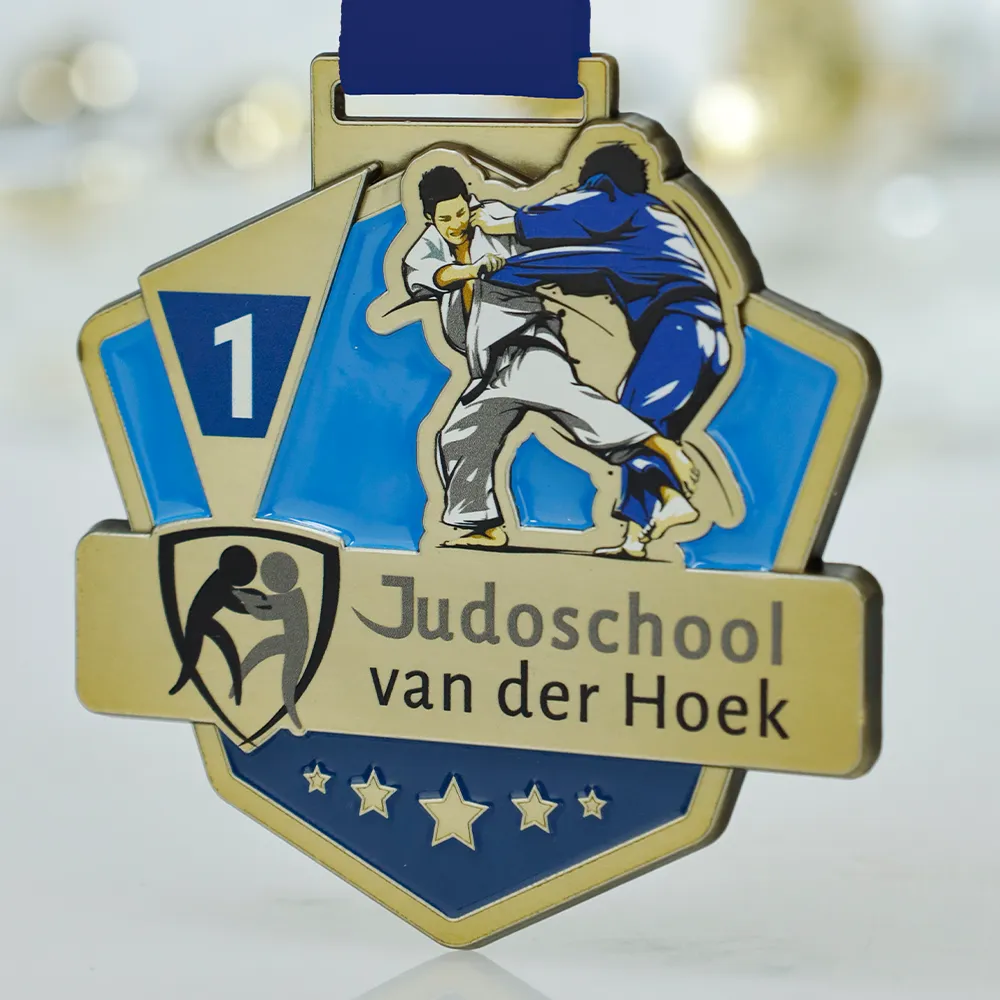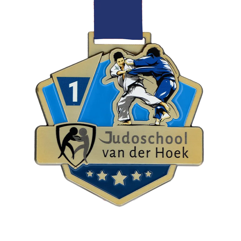 Printed cast medal created for JudoSchool van der Hoek. The front features a vibrant image of two judo athletes in combat and the school’s logo.