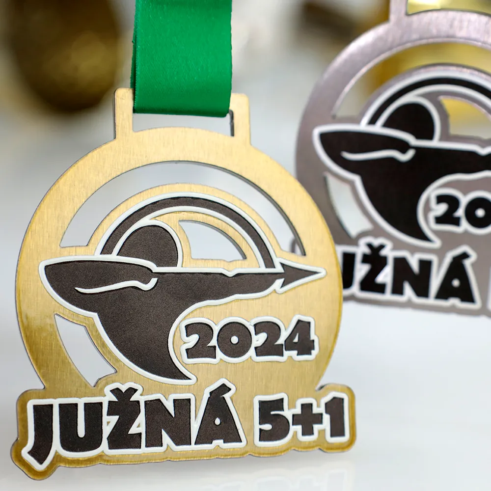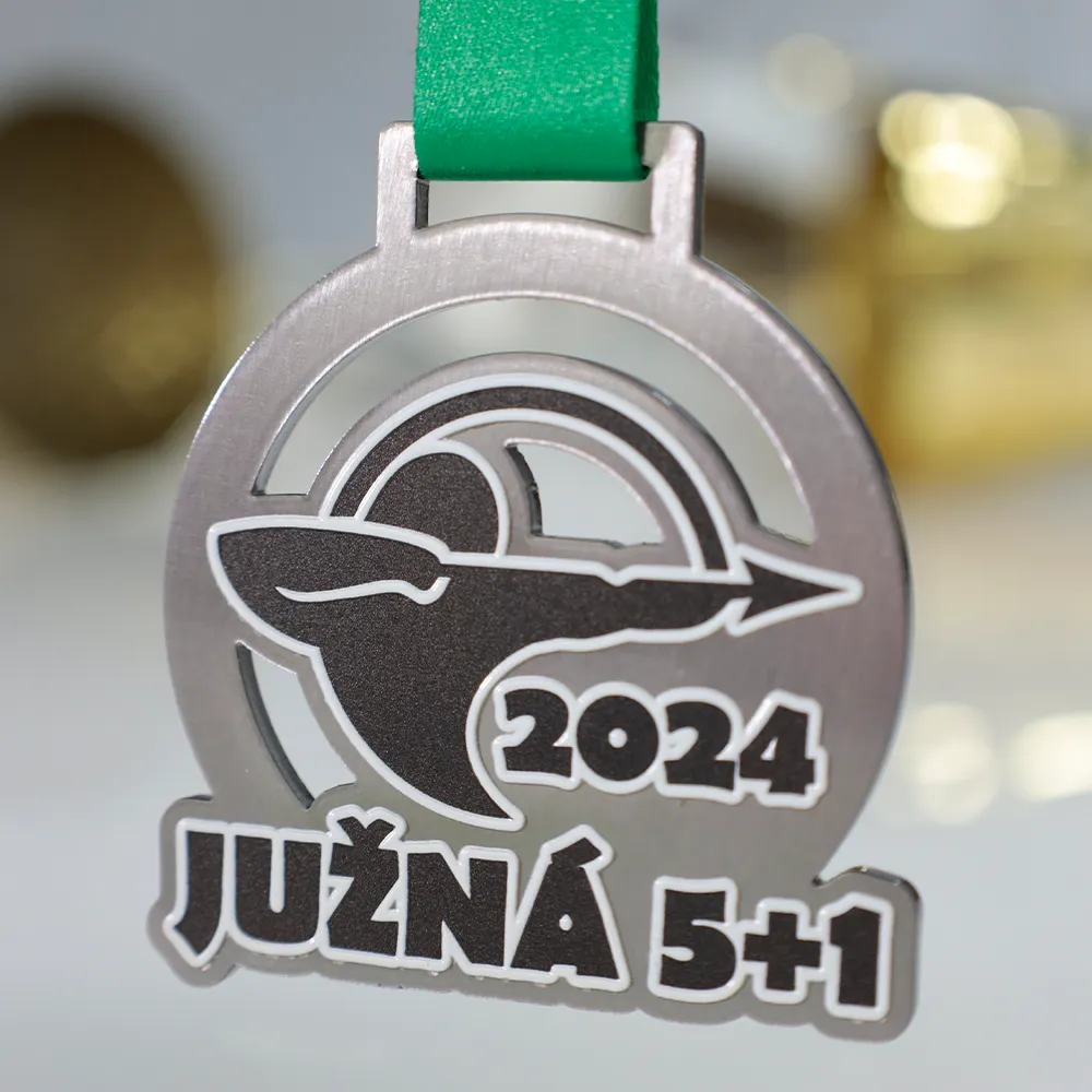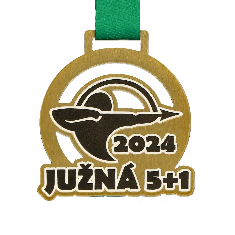 A custom medal for participants of the archery competition Južná 5+1 2024. The medal features a dynamic image of an archer with a bow, printed using UV printing.