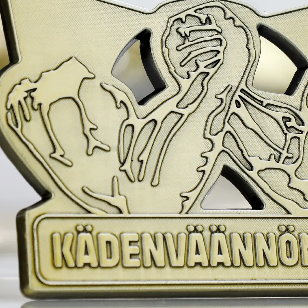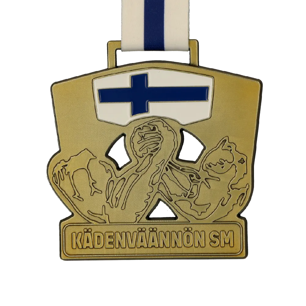 A cast medal designed for Kädenväännön SM – the Finnish Arm Wrestling Championships. The medal has a gold colour with a cast pattern depicting the competitors’ struggles. At the top, there is a Finnish flag, emphasising the national character of the event. The name of the tournament is clearly written on the bottom edge. The medal is hung on a white ribbon with a blue stripe, referring to the national colours of Finland.