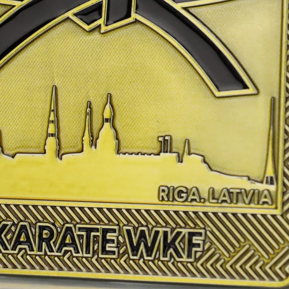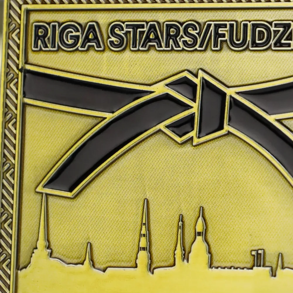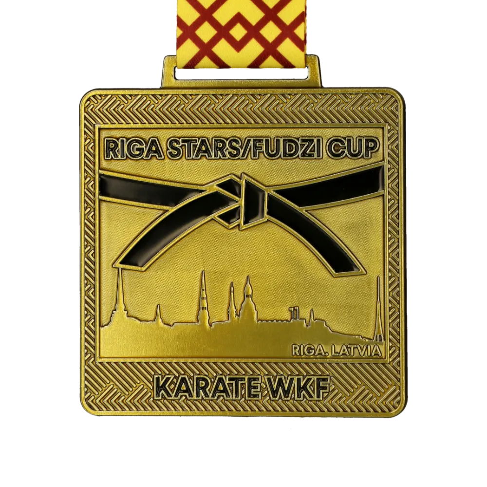 Bespoke medal created for the Riga Stars/Fudzi Cup karate tournament, designed for WKF athletes. The front features a raised black karate belt and the silhouette of Riga's skyline. The event name and sport category are displayed at the top and bottom. The bespoke medal is suspended from a yellow ribbon with a red pattern inspired by traditional Latvian motifs.
