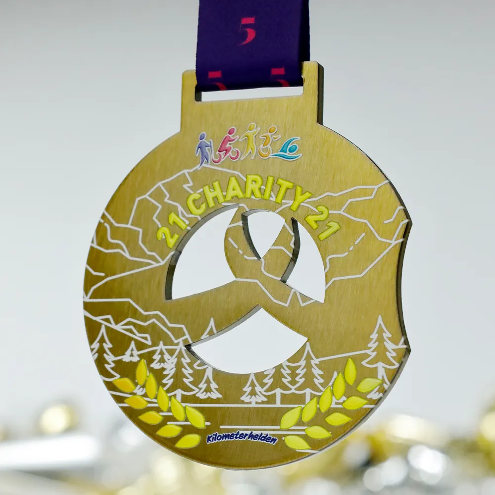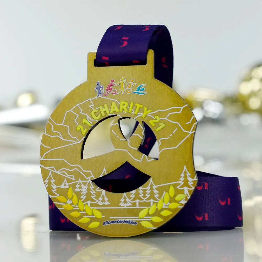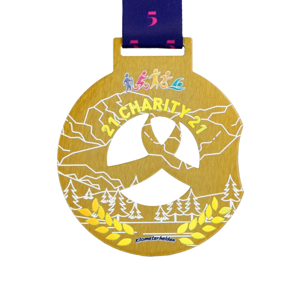 Custom medal prepared for the Charity 21 event organised by Kilometerhelden. The medal shape was made with laser cutting, with an openwork cut-out in the centre. Inscriptions and graphics, including outlines of mountains, forest, and athlete figures, were made using UV printing. The medal is finished in gold colour and suspended on a navy blue ribbon.