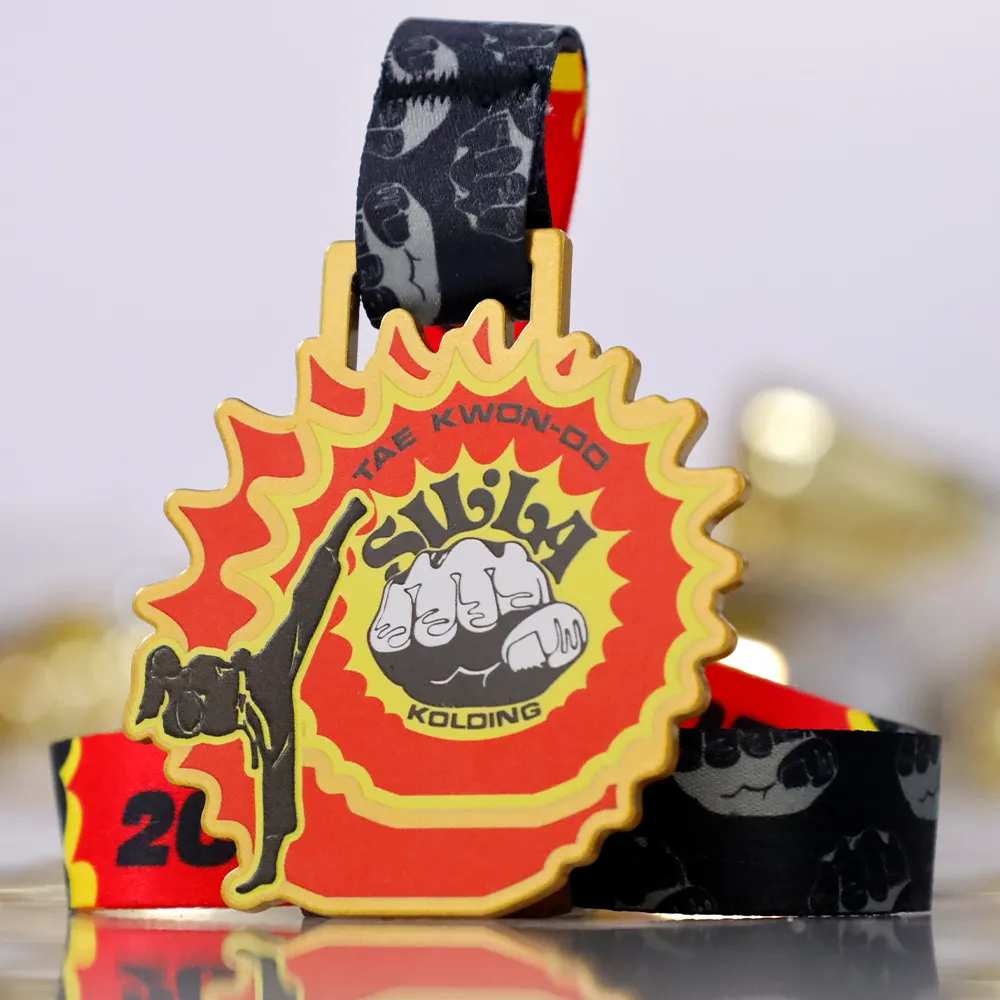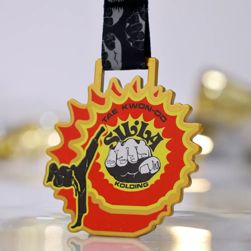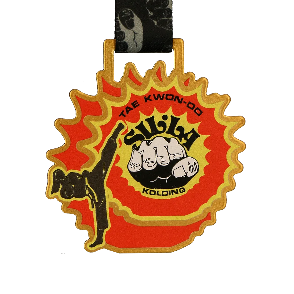 Sport medal designed for the Taekwondo tournament in Kolding. A dynamic motif of a kick and clenched fist against red-yellow flames made using UV print. The medal is personalised with the club and city name. A black ribbon with a printed fist motif is included.