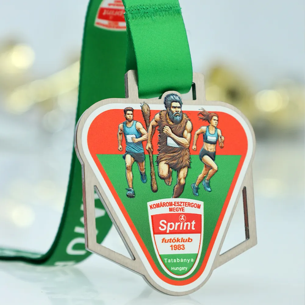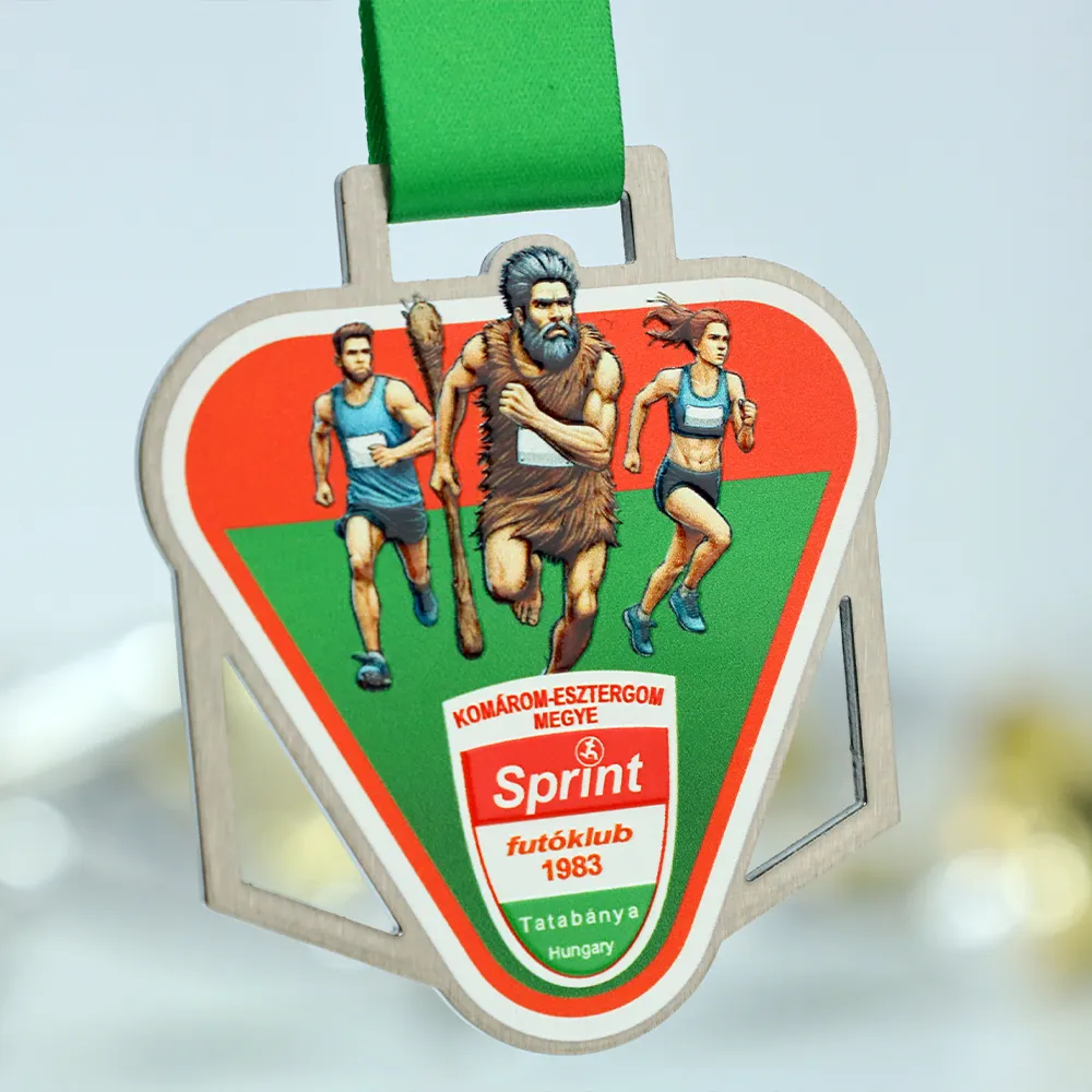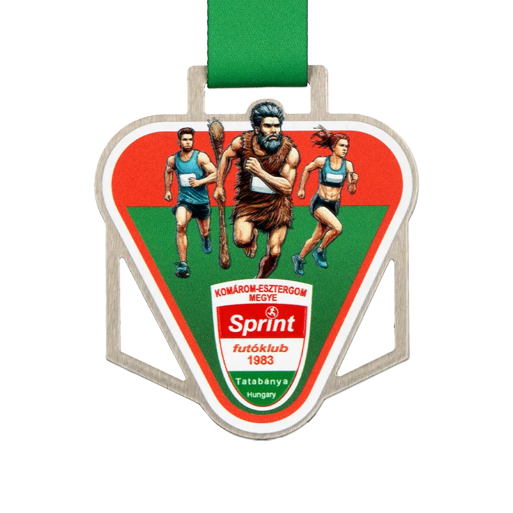 This eye-catching running medal, prepared for Komárom-Esztergom Megye Sprint Futóklub, catches the eye with its original design. Made of high-quality steel, it has a unique shield shape and the vivid colors of the Hungarian flag applied using modern UV printing techniques. The central caveman figure gives the whole piece a unique character, perfectly suited to the unique atmosphere of the event.