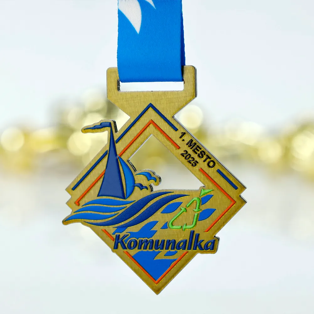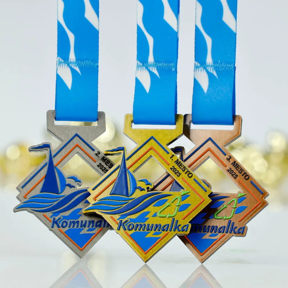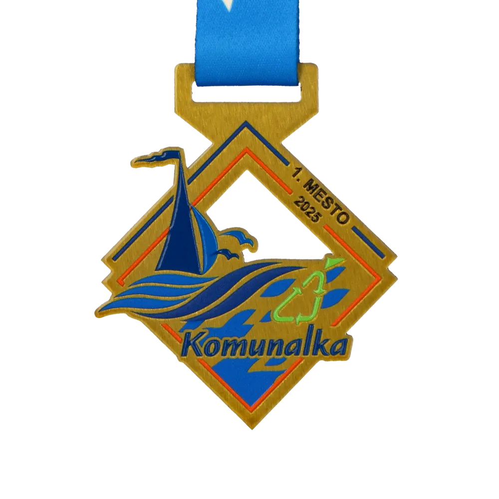 Bespoke medal made of metal, laser-cut. Designed for the Komunalka 2025 regatta or sailing competition. The medal features a yacht, waves, and a seagull motif, while colourful details are applied with durable UV print. Personalisation includes the event name, edition, and year.